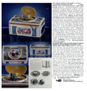 Triberg. Silber mit Emaillebildmalerei, nach Jacob Frisard, Modell Nr. 7, mit Federwerkantrieb, Vogel in schillerndem Original-Federkleid (waldgrün, blau und goldfarben), bewegliche Flügel mit roten Spitzen, Me- tallschnabel und Schwanz, drehbar auf Stange, guillo- chiertes Silbergehäuse mit verstecktem Fach für den Schlüssel, aquamarinblaue Paneele im Starburst-Stil vorne und auf den Seiten, Stilleben auf der Vorder- und Rückseite sowie auf dem Deckel, mit Darstellung einer Delfter Schüssel, eines Sittichs und von Pfirsichen auf der Oberseite, eines Hummers, eines Kelchs und von Blumen auf der Vorderseite und geschälter Früchte, eines Insekts und einer Schnecke auf der Rückseite. Der ovale Deckel zeigt einen Küken fütternden Jungen. Maße 9,5 x 6 x 4 cm, mit Schlüssel, gut funktionieren- der Zustand. – In Reise-Etui mit Lederbezug, gemarkt "Lancel, 38 Blvd. des Italiens, Paris". – Während die detaillierten Motive auf den Seiten und dem Deckel an holländische Stilleben und Darstellungen von Opulenz und Vergänglichkeit erinnern, ist das Portrait des Jun- gen, der Küken füttert, eine Hommage an den berühm- ten Automatenhersteller Jacob Frisard (1753–1812). Das hier angebotene Modell gehört zu den ersten Sing- vogeldosen, die im Werk von Griesbaum hergestellt wurden. – Literatur: Geoffrey T. Mayson, "Mechanical Singing Bird Tabatières", S. 106. – Eine Singvogeldose in Museumsqualität!