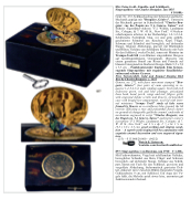 Mit Federwerkmotor, Vogel mit schillerndem Gefieder, beweglicher Schnabel aus Bein, Flügel und Schwanz beweglich, auf drehender Stange, Gehäuse aus Schild- patt, hinten mit Fach für den Schlüssel, gravierte und vergoldete Abdeckung, bichromatisch gravierter Dek- kel, dekoriert mit 2 zwischen Blüten fliegenden Vögeln, Gehäusebreite 9 cm, mit Schlüssel. Ein Auge des Vo- gels fehlt, die Melodie spielt etwas leise, ansonsten gut funktionierender Zustand.