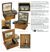 Musikwerke Orpheus Ludwig & Co., Leipzig. Für Blechplatten Ø 34 cm, 64 Töne im Musikkamm (kom- plett), sichtbarer Federwerkmotor, Abdeckung aus ge- ätztem Glas, bunte Lithographie im Deckel mit Darstel- lung von Neptun, Nußbaumgehäuse, Bronzegriffe, mit 8 Platten, sehr gut spielender Zustand.