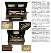 Nr. 2126, 10 Melodien inklusive "Hymne aux Oiseaux" und einer Auswahl aus den Opern "Lucrezia Borgia" von Donizetti, "Les Huguenots" von Meyerbeer und "Mignon" von Thomas, Gamme Nr. 4722, 56 Töne im Musikkamm, 14 Zähne für die Begleitinstrumente (alle komplett), 15 Orgel-Töne, abschaltbare Trommel, 6 Glocken mit Schmetterling-Schlegeln, Original-Melo- dienblatt, attraktiv gestaltetes Gehäuse, Deckel mit Einlegearbeit, Motiv: brütender Kolibri, Gehäusebreite 80 cm, Walzenbreite 48,5 cm, Deckel innen mit repa- riertem Riß. Das Spielwerk und das Gehäuse befin- den sich in gut restauriertem Zustand. Eine große und beeindruckende Orchester-Walzenspieldose mit interessantem Zusammenspiel von Orgel und Begleitin- strumenten.