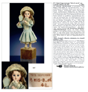 Mit seltenem Charakterkopf, rot gestempelt "Tête Déposé, Paris Bébé 4" und Künstlermarke "L", mit geschlossenem lächelndem Mund, zarter spitzer Nase, prallen Wangen, feststehenden blauen Paperweight- Augen, durchstochenen Ohrläppchen mit Ohrringen, gelockter blonder Mohairperücke auf Korkdeckel, Hän- de aus Biskuitporzellan, einen Blumenstrauß und einen Fächer haltend, in geriffeltem aquamarinblauem Ko- stüm mit passendem Hut, auf samtbezogenem Sockel mit Federwerk, Mechanik und einem Walzenspielwerk für eine Melodie. Gesamthöhe 47 cm. – Bébé dreht ihren Kopf und nickt, hebt mit der linken Hand die Blumen hoch, während die andere Hand den Fächer dreht. – Ein nahezu unsichtbarer Haarriß (und minimale Retuschierung?) vom Hals unten rechts bis zum Nasen- rücken. Mit Lambert-Messingschlüssel. – Ein klassi- scher Lambert-Automat mit besonderem Biskuitpor- zellan-Charakterkopf, kreiert von Emile Jumeau, nachdem er die alleinigen Rechte an den Namen "Paris Bébé" in einer Klage gegen seinen Konkurrenten und ehemaligen Firmenvorarbeiter Anatole Danel gewonnen hatte. Dieser Kopf ist selten bei Puppenautomaten zu finden.