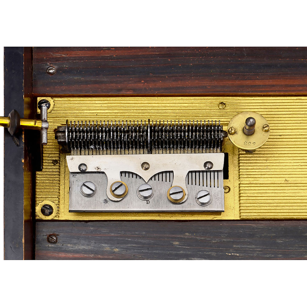 Hersteller: Ludwig & Co. Markranstädt. Für Blechplatten Ø 20,3 cm, 41 Töne im Stahlkamm (komplett), Hebelaufzug. Die Platte dreht gegen die Uhrzeigerrichtung, die Dämpfer sehen aus wie ein Zitheraufsatz. Nußbaumgehäuse mit Original-Lithographie im Deckel, mit 12 Platten, gut spielender Zustand. – Das einzige bekannte Aegir-Instrument! Eine umfangreiche Dokumentation liegt diesem Lot bei.
