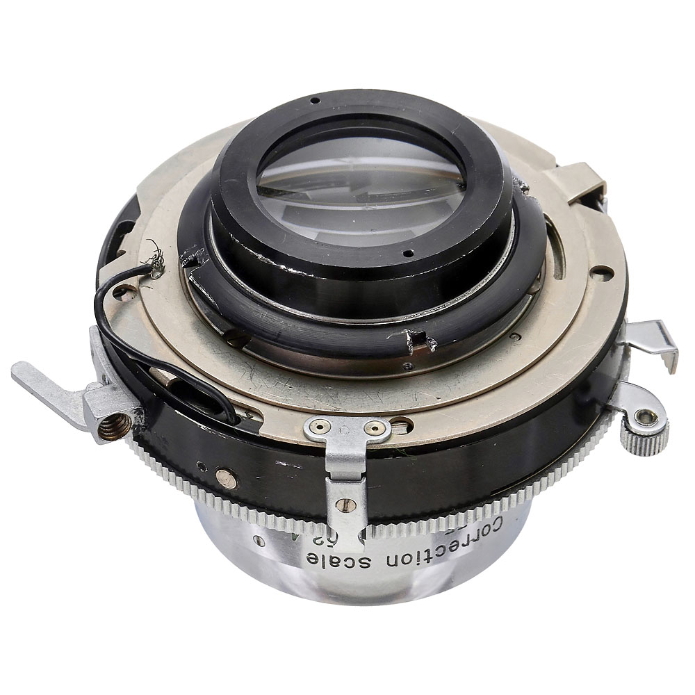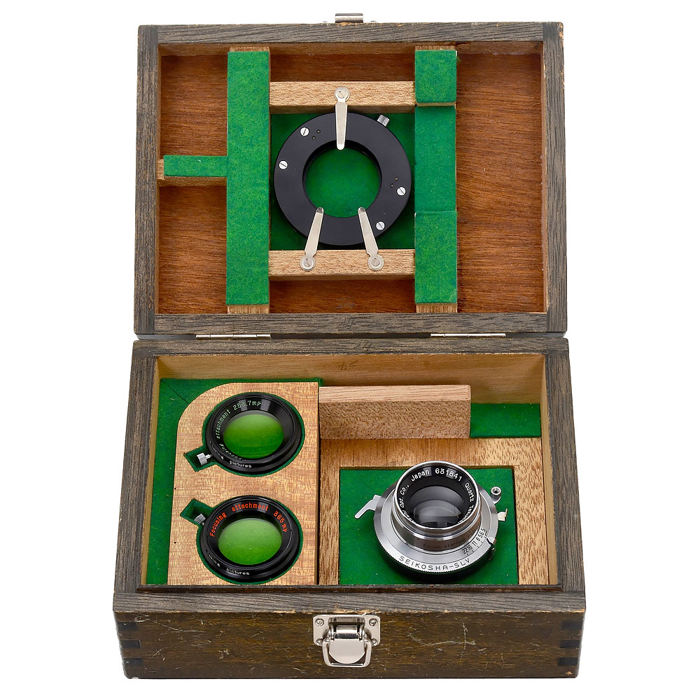 Asahi Opt. Co., Japan. Nr. 631841, in Seikosha-SLV-Verschluß, kann nur auf T geöffnet werden, Frontglied ist verstellbar und graviert mit “Correction scale”, “Unit cm” und “Focus starting point”, Glas unter Punktlicht sauber, mit beiden Fokussierfiltern “Focusing attachment 253,7 μm” und “Focusing attachment 365 μm” (Festhalteschraube lose) und einem Filterhalter. Oben auf dem Holzkasten handschriftlich betextet mit Typ, Hersteller und Datum (Shigaisen-Yoh-Suisyo-Renzu, Kristall-Optik für ultraviolette Strahlen; Asahi-Kogaku-Kogyo_Kabushiki-Gaisya; Showa 37 Nen Gatsu Sei). Nur für Verwendung in UV, laut Einlieferer eine Einzelanfertigung für die schwedische Polizei. Achromatische Korrektur für 200 bis 400 Nanometer. Eine der ersten UV-Optiken aus Japan überhaupt.