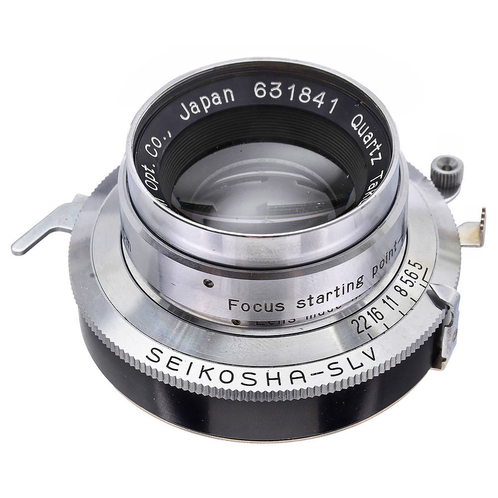Asahi Opt. Co., Japan. No. 631841, in Seikosha SLV shutter, can only be opened to T. Lens front part is adjustable and engraved with “Correction scale”, “Unit cm” and “Focus starting point”. Glass clean under point light. Comes with both focusing filters, “Focusing attachment 253.7 μm” and “Focusing attachment 365 μm” (locking screw loose), and a filter holder. Handwritten text on the top of the wooden box includes the type, manufacturer, and date (Shigaisen-Yoh-Suisyo-Renzu, Crystal lens for Ultraviolet Rays; Asahi-Kogaku-Kogyo_Kabushiki-Gaisya; Showa 37 Nen Gatsu Sei). For UV use only; according to the consignor, a custom-made lens for the Swedish police. Achromatic correction for 200 to 400 nanometers. One of the first UV lenses ever made in Japan.