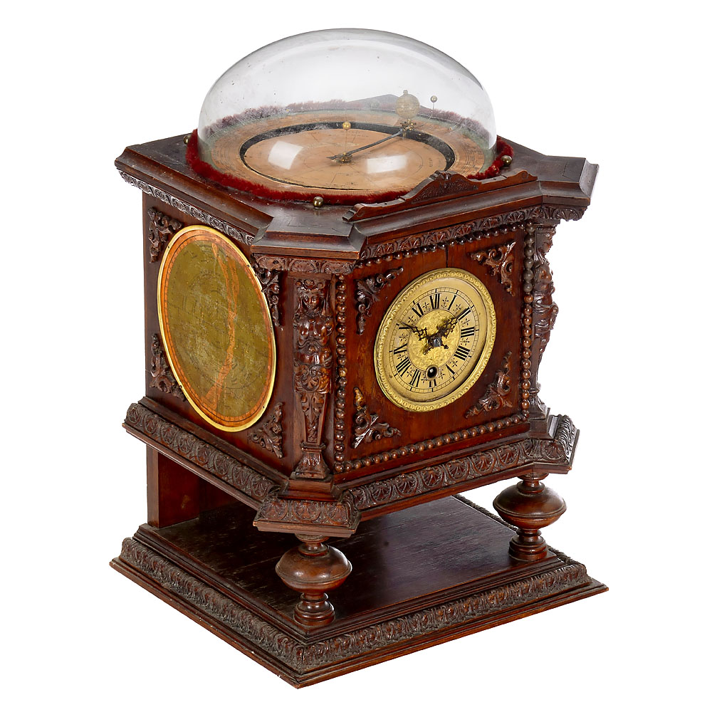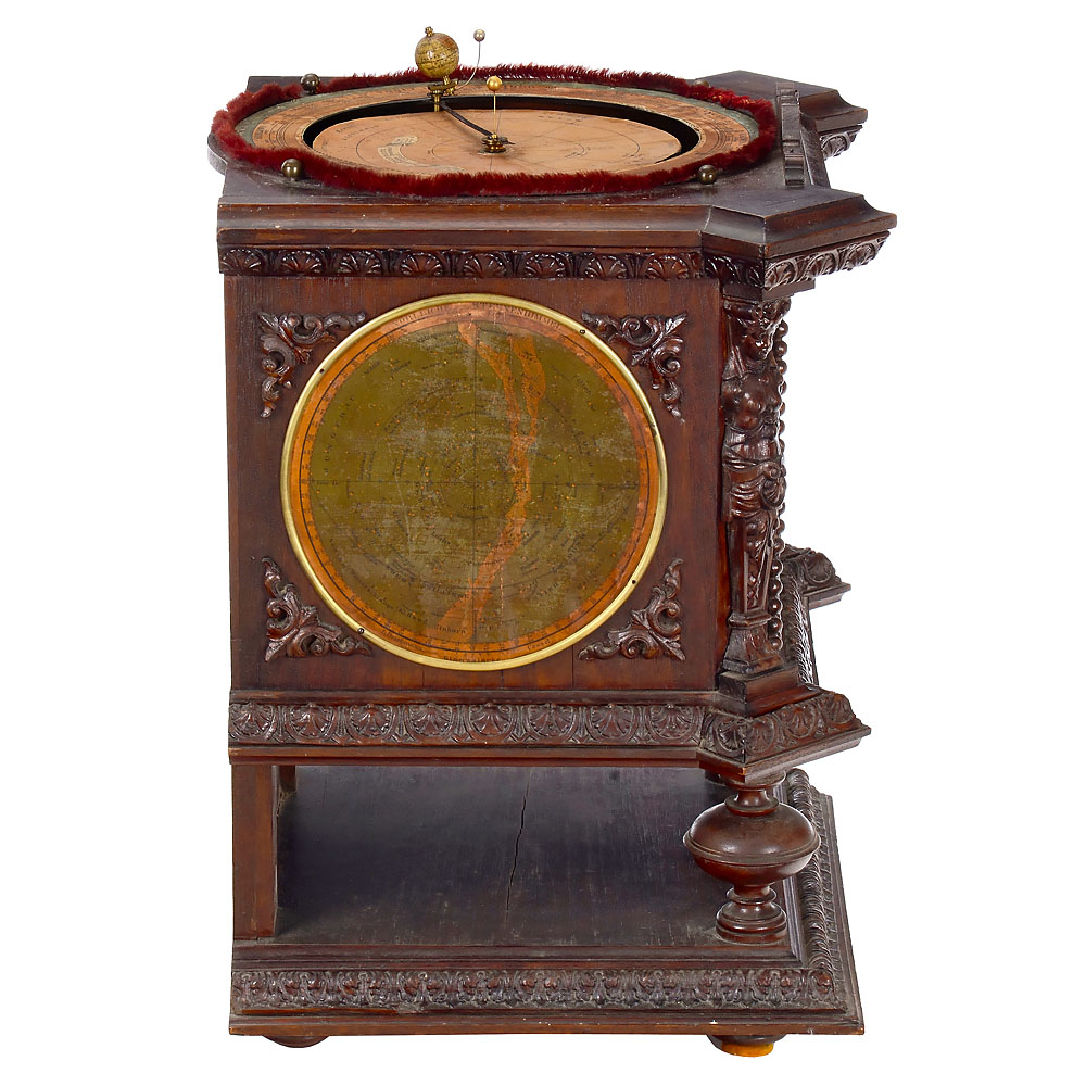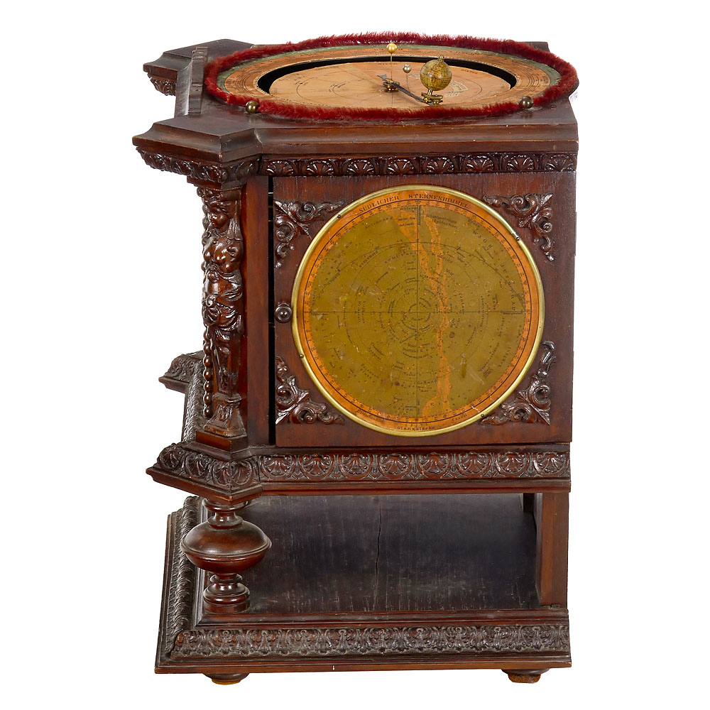 L. Deichmann, Geographical Institute, Cassel, Germany. Walnut case with carved decorations, lithographed maps of the northern and southern skies on the sides with the positions of the brightest stars and constellations in frames, door on the right-hand side, printed instructions inside, etched brass dial with Roman numerals, Ø 5 in., mechanical pendulum clockwork by Gustav Becker, the clockwork is connected to the mechanism of the tellurium via brass gears, moon and sun represented by small balls, globe with lithographed paper segments on wooden sphere, above paper scales with season, date and signs of the zodiac, under glass dome, overall dimensions 14 ½ x 12 ½ x 21 2/3 in., in working order (no guarantee on running time or accuracy).