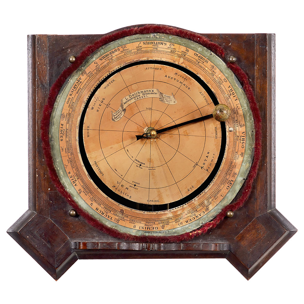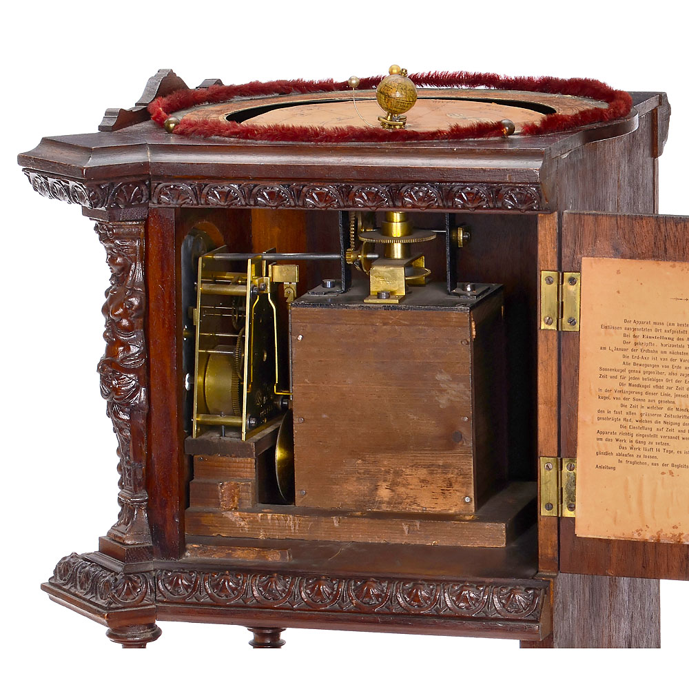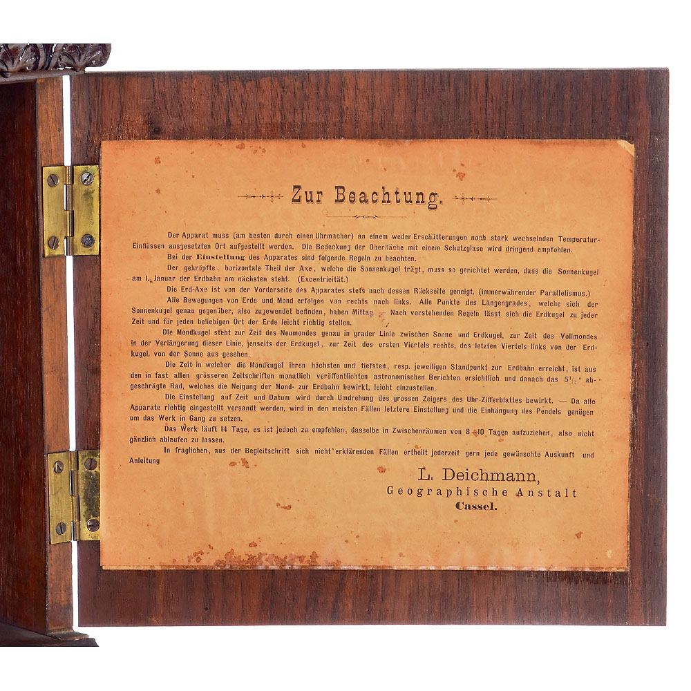 L. Deichmann, Geographische Anstalt, Cassel. Nußbaumgehäuse mit geschnitzten Verzierungen, seitlich lithographierte Karten des Nord- und Südsternhimmels mit den Positionen der hellsten Sterne und Sternbilder in Rahmen, Tür auf der rechten Seite, innen mit gedruckter Anleitung, geätztes Messing-Zifferblatt mit römischen Zahlen, Ø 13 cm, mechanisches Pendeluhrwerk von Gustav Becker. Das Uhrwerk ist über Messing-Zahnräder mit der Mechanik des Telluriums verbunden. Mond und Sonne dargestellt durch kleine Kugeln, Globus mit lithographierten Papiersegmenten auf Holzsphäre, über Papierskalen mit Jahreszeit, Datum und Tierkreiszeichen, unter Glashaube, Gesamtmaße 37 x 32 x 55 cm, funktioniert (ohne Garantie auf Laufdauer und Genauigkeit).
