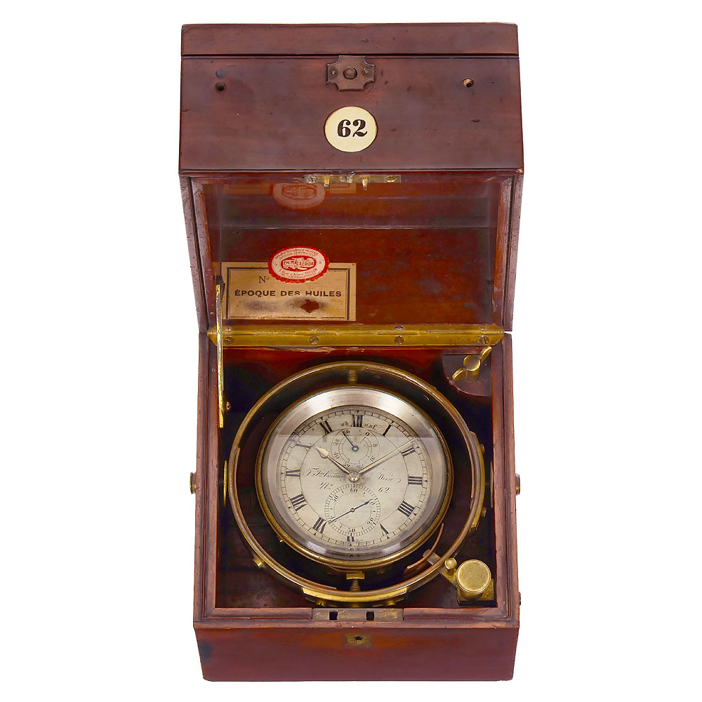 Signed on the 3 1/3-inch silvered dial: “F. Jos. Vorauer in Wien – No. 62”, outer minute ring with Arabic numerals, small seconds over the VI, power reserve indicator in the upper arch, indication in 8-hour steps, brass plate movement, winding with fusee and chain, weighted balance, gimbaled in three-part mahogany case, 6 ¾ x 6 ¾ x 7 in., brass side handles, with winding and case keys, good working condition. – Franz Josef Vorauer (1813–1866) was an important Viennese watchmaker known for his outstanding achievements in the field of chronometry.