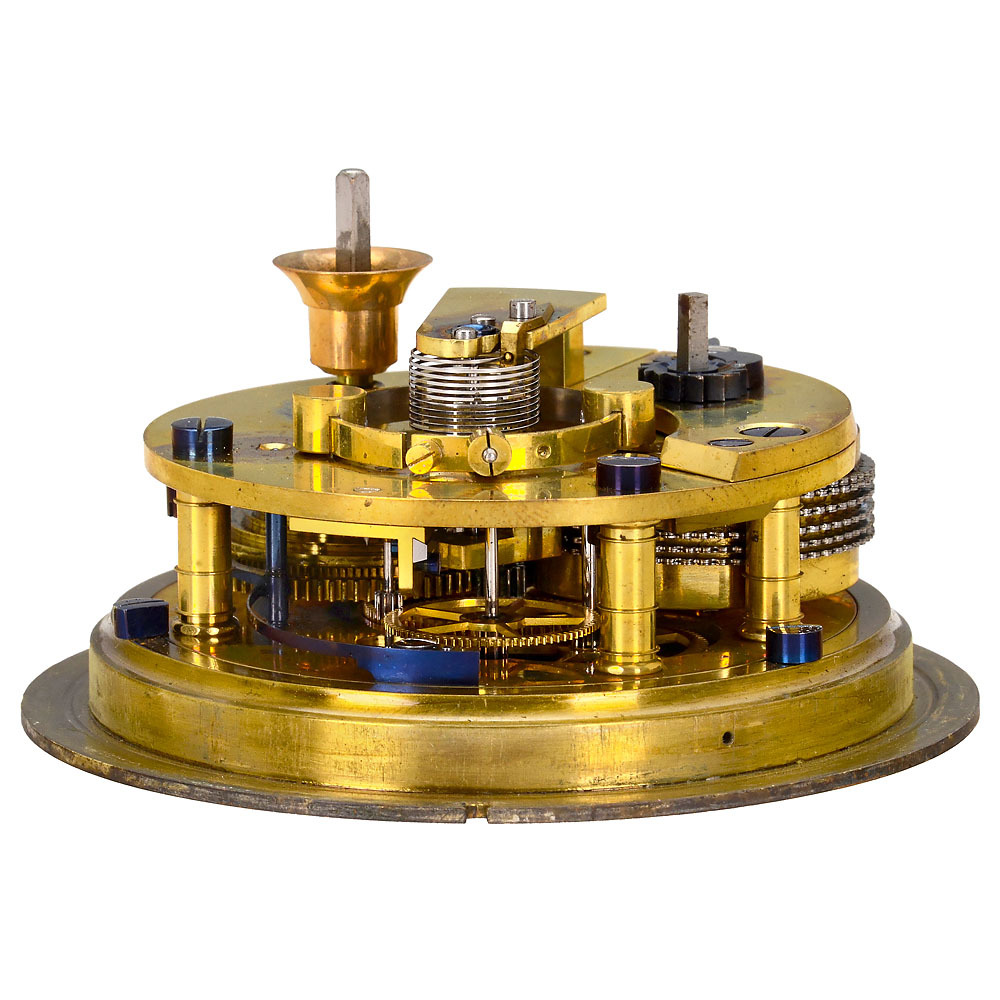 Signiert auf dem versilberten 8 ½ cm großen Zifferblatt: “F. Jos. Vorauer in Wien – No. 62”, äußerer Minutenring mit arabischen Zahlen, kleine Sekunde über der VI, Gangreserve-Anzeige im oberen Bogen, Anzeige in 8-Stunden-Schritten, Messing-Platinen-Werk, Aufzug mit Schnecke und Kette, gewichtete Unruhe, kardanisch gelagert in dreiteiligem Mahagonikasten, 17 x 17 x 18 cm, seitliche Messinggriffe, mit Aufzug- und Kastenschlüssel, gut funktionierender Zustand. – Franz Josef Vorauer (1813–1866) war ein bedeutender Wiener Uhrmacher und für seine hervorragenden Leistungen auf dem Gebiet der Chronometrie bekannt.