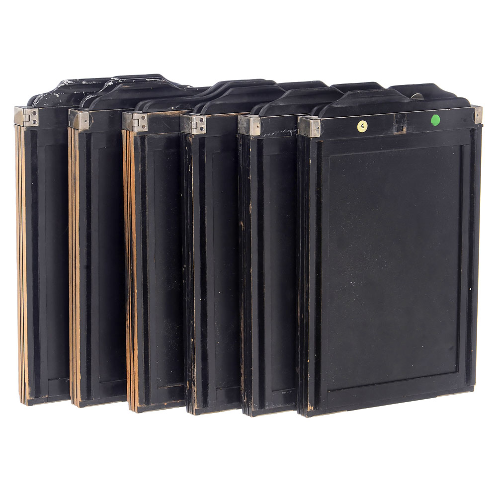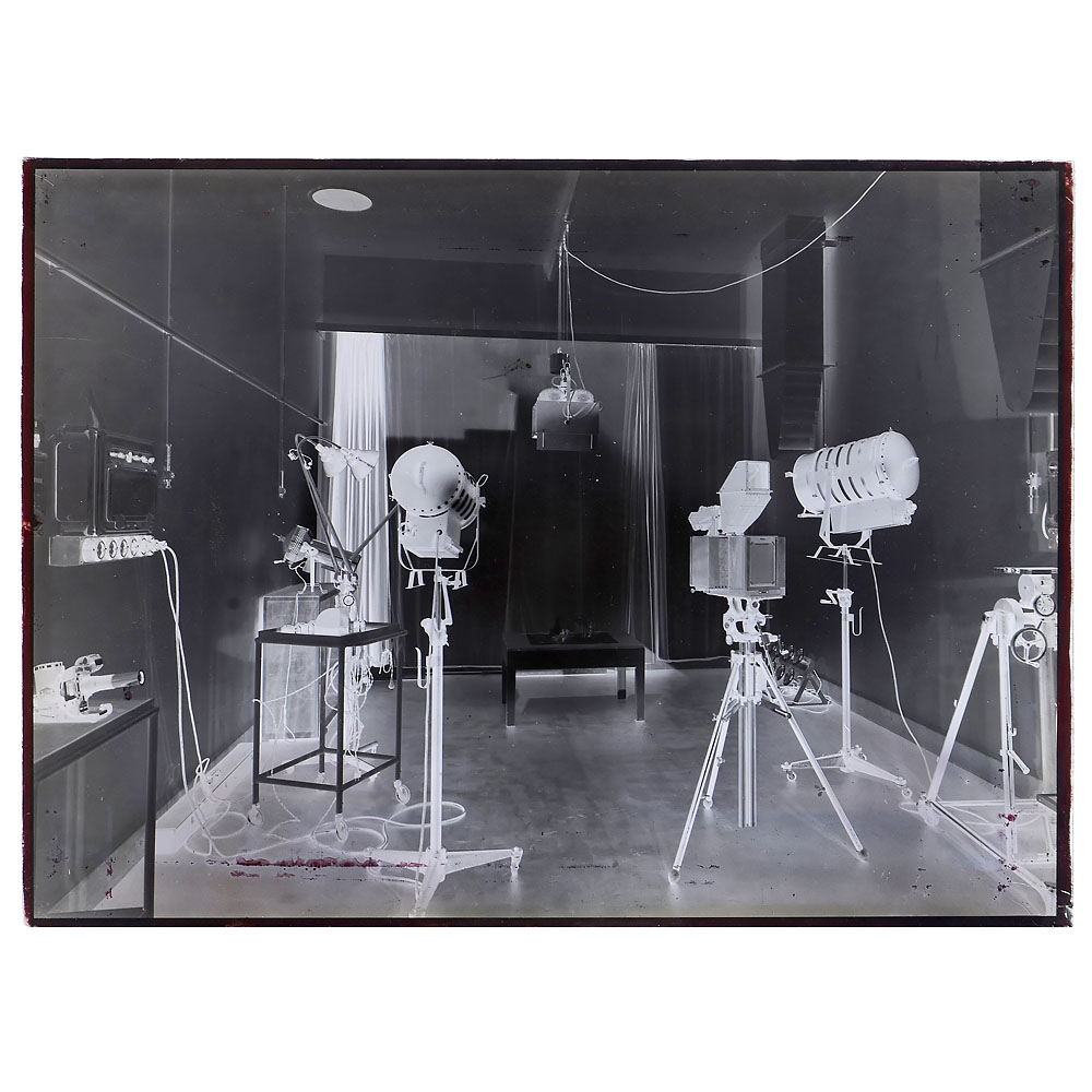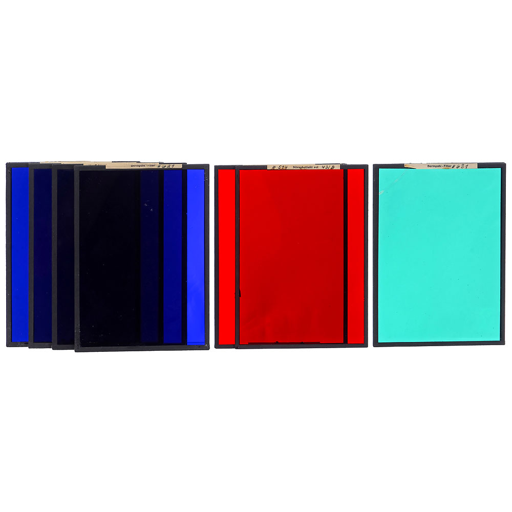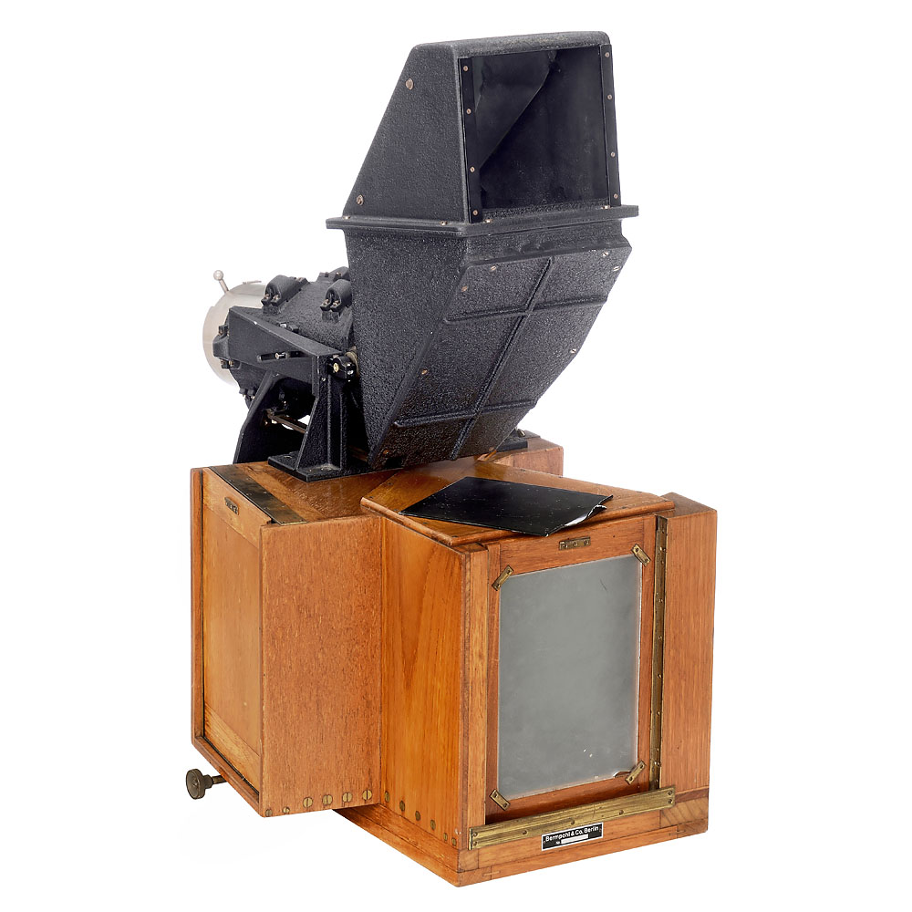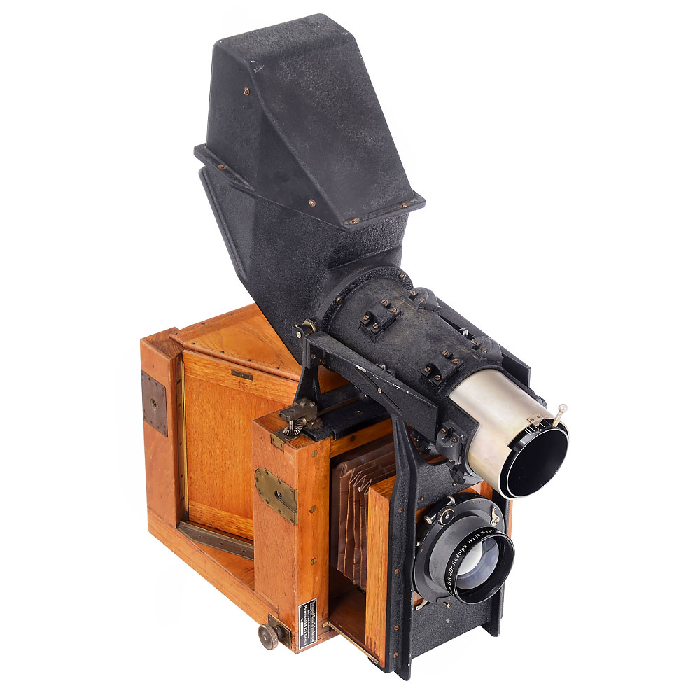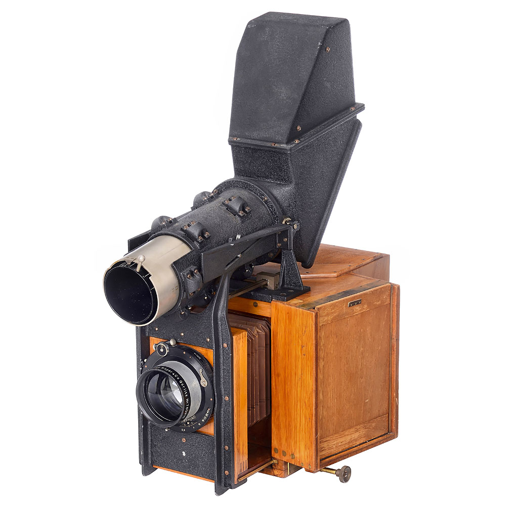 Bermpohl & Co., Berlin. Sehr wichtiges Exponat zur Geschichte der Farbphotographie. Gehäuse-Nr. 681, Aufnahmeformat 13 x 18 cm, mit Meyer Doppel-Plasmat 4/30 cm Nr. 780910 in Compound, läuft mit gleicher Zeit. Edelholzgehäuse mit Messingbeschlägen. Die drei Strahlenteiler im Inneren sind optisch sauber, ebenso der kameranummerngleiche Strahlenteilersatz der 3 Bermpohl-Filter Blau/Grün/Rot sowie 4 weitere Zusatzfilter (514 Nitraphotlicht rot 43/B, 514 Nitraphotlicht blau 41/C, Vacublitz blau 44B und Versuchsfilter blau 28L). Mit dem extrem seltenen Reflexaufsatz mit Parallaxenausgleich. Die Sucheroptik ist anscheinend ebenfalls ein Doppel-Plasmat. Ohne Auszug ist das Bild korrekt auf unendlich, Auszug wegen des Gewichts des Reflexsuchers etwas mühsam, mit den beiden Schutzschiebern, Mattscheibe und 6 Doppelkassetten. Dazu ein Negativ 18 x 24 cm jenes Industrie-Studios, wo diese Kamera als der Stolz der Firma (Druckmaschinenhersteller) aufnahmebereit zu sehen ist. – Sehr seltene und großartige Kombination in einem anwendungsgeeigneten Zustand.
