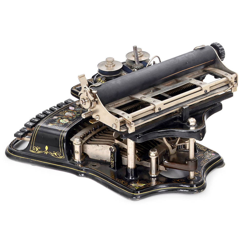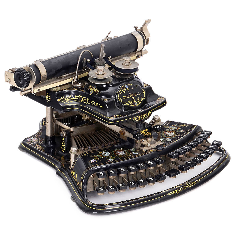 The Crandall Type Writer Co., Syracuse, N.Y. Serial no. 6467, with vertical type sleeve and curved two-row keyboard, one of the most attractive typewriters with its mother-of-pearl and gilt decoration, platen rubber torn, type sleeve does not turn, very good original optical condition. – A superb pioneer of office communication, collector’s item and museum piece. – With book: “American Typewriters”