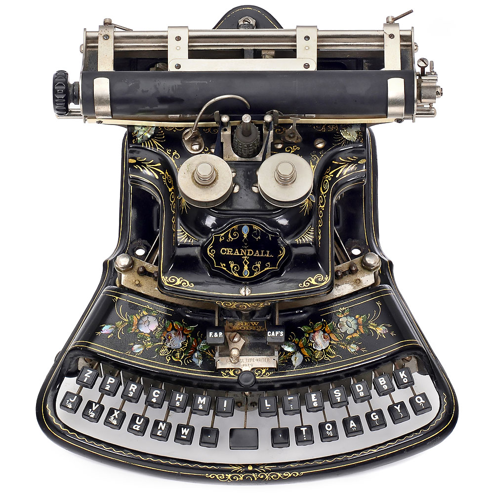 Hersteller: “The Crandall Type Writer Co., Syracuse, N.Y.” Serien-Nr. 6467. Original erhaltenes Modell der beliebten und wohl dekorativsten amerikanischen Typenzylinder-Schreibmaschine, gebogene zweireihige Tastatur. Mit Perlmutteinlagen und Golddekor! – Pionier der Schreibmaschinengeschichte, eines der ganz großen Sammlungs- und Ausstellungsstücke. Walzengummi gerissen, Typenzylinder dreht sich nicht, sehr guter optischer Originalzustand! – Mit Buch: “American Typewriters”