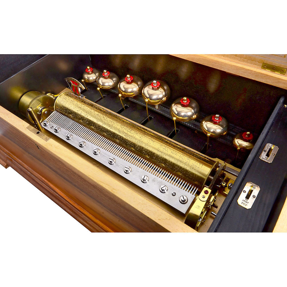 Hersteller: “Ami Rivenc”, Genf. Schweizer Walzenspieldose, mit 7 sichtbaren Glocken, Messingwalze mit 10 Titeln inklusive Hochzeitsmarsch von Richard Wagner, Breite 39 cm, 87 Töne im Stahlkamm (komplett), Doppel-Federmotor, Melodienanzeiger, neues massives Nußbaumgehäuse mit Messing-Griffen und -Ornament. Maße 76 x 40 x 31 cm. Melodienzettel (Kopie). Sehr gut spielender Zustand.