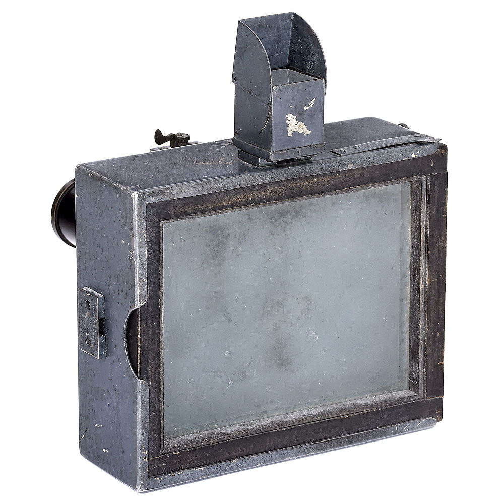 Cie Française de Photographie, Paris, 7 Rue Solférino. No. 253, stamped: “France & Etranger”, for 9 x 12 cm, 5 shutter speeds adjustable via spring tension on the hemisphere, functions perfectly, focusing mechanism on the unmarked 8/130 mm aplanat lens is fixed, with original viewfinder (lens with a crack), original focusing screen back, and double cassette. Camera anodizing in unusually good condition. – A sought-after classic.