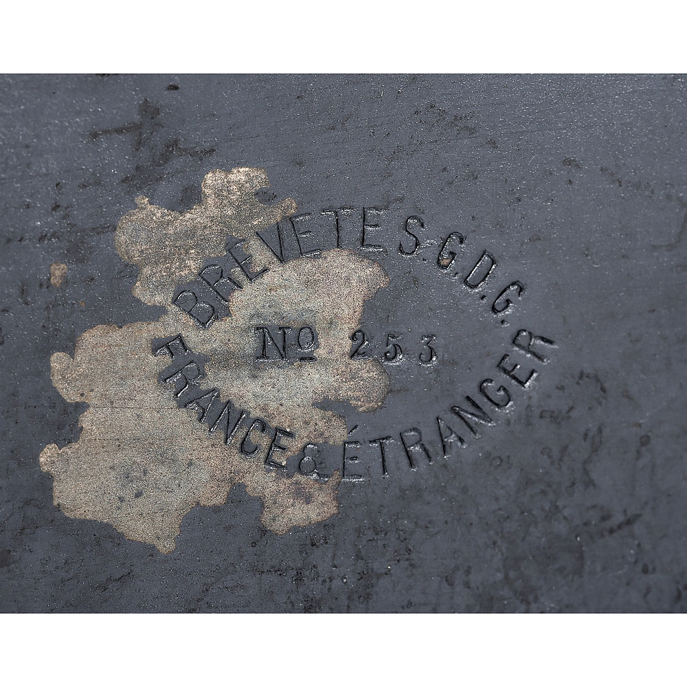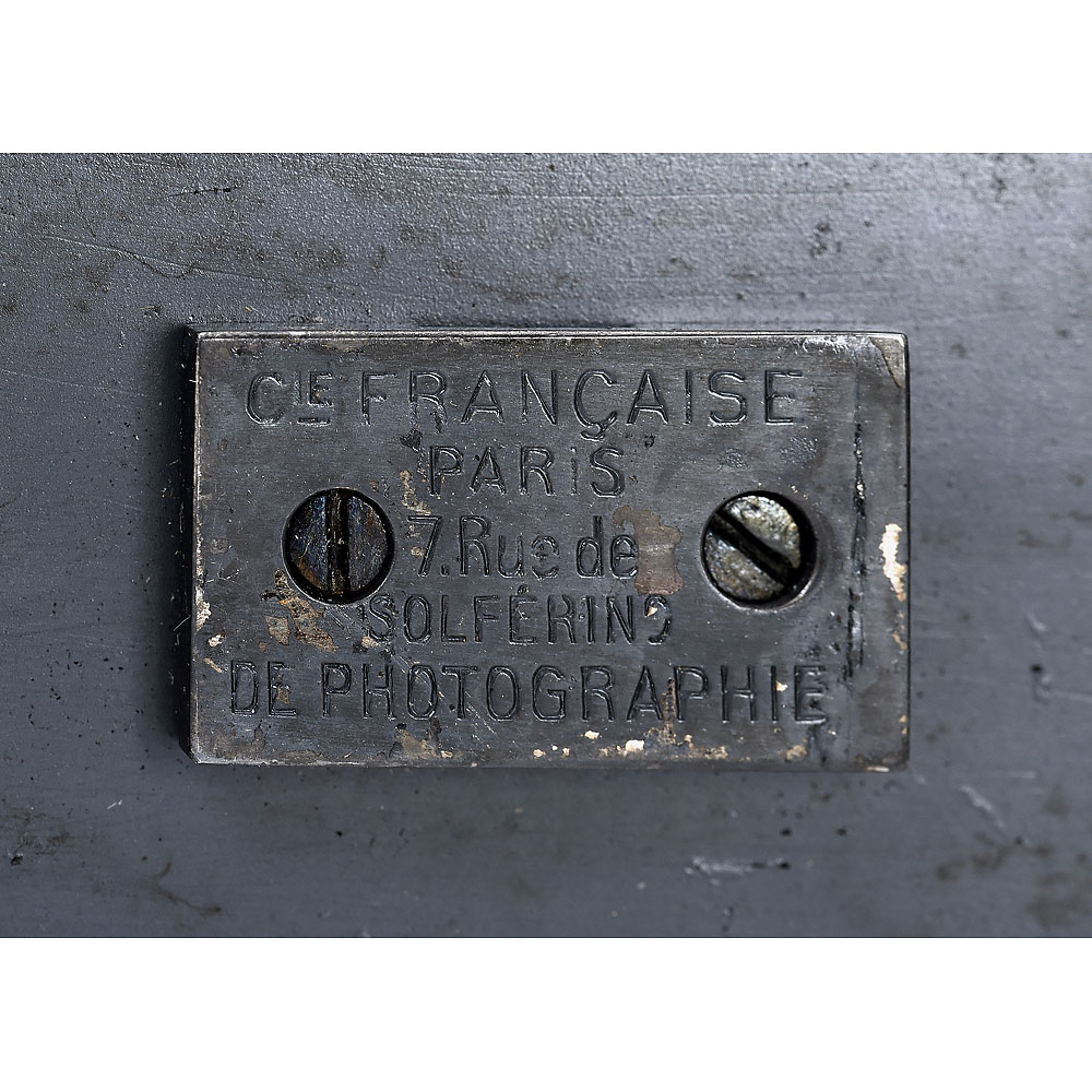Cie Française de Photographie, Paris, 7 Rue Solférino. Nr. 253, geprägt: “France & Etranger”, für 9 x 12 cm, 5 Verschlußzeiten der Halbkugel über Federspannung einstellbar, läuft einwandfrei, an unbezeichneter Aplanat-Optik 8/130 mm ist die Fokussierung unbeweglich, mit Original-Sucher (Linse mit Riß), Original-Matt¬scheiben-Rückteil und Doppelkassette. Kamera-Eloxierung in ungewöhnlich gutem Zustand. – Gesuchter Klassiker.