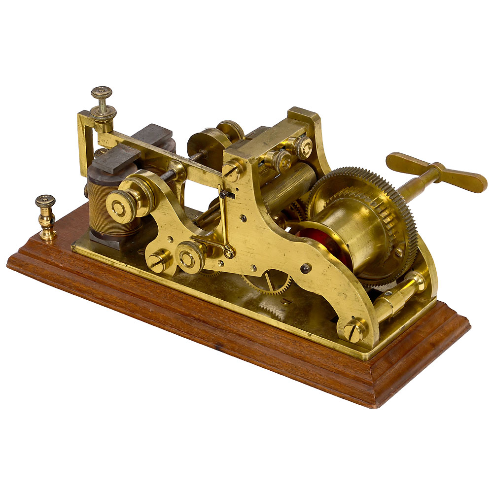 S.W. Chubbuck, Utica, New York, Nr. 2061, mit Gewichtantrieb, Messing, auf Mahagonisockel. – Chubbuck-Telegraphen dienten als Baumuster für die ersten in Deutschland (Siemens & Halske) und Österreich (Ekling) hergestellten Modelle. Chubbuck lieferte auch den ersten Morsetelegraphen nach Deutschland für die Schiffsmeldelinie Cuxhaven – Hamburg im Jahr 1848. – Sehr selten!