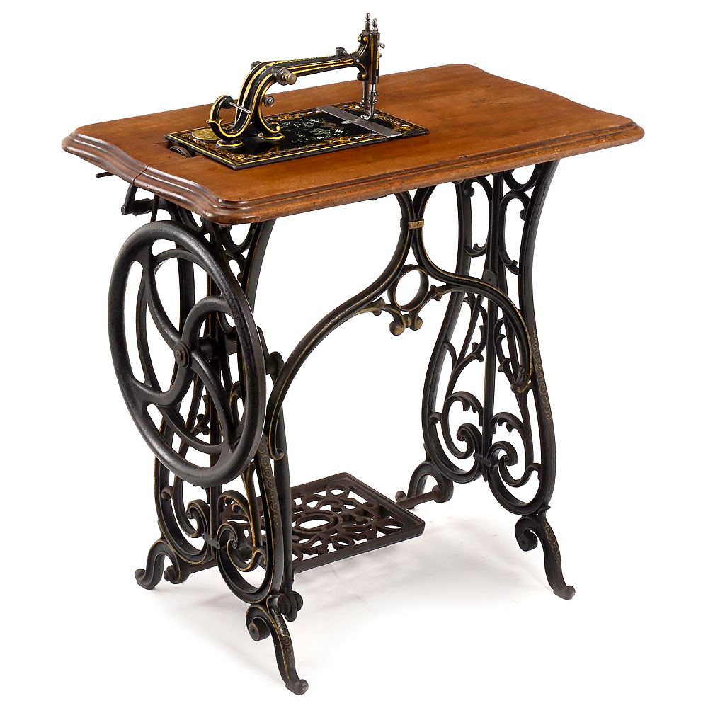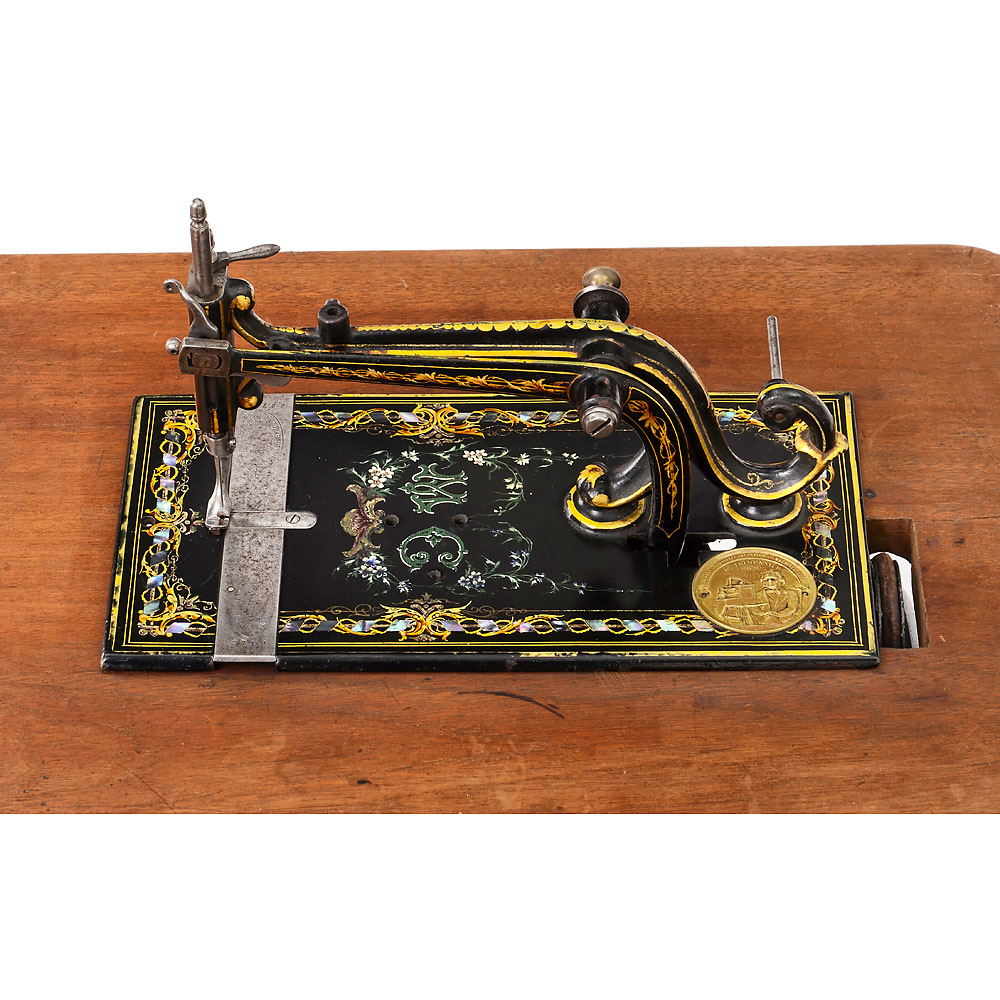 “Machine de grand Plaisir”. Gußeisen, schwarz lackiert. Die Maschine hat ein aufwendiges Dekor mit funkelnden Perlmutteinlagen. Eine Messingplakette zeigt Thimonnier, den (französischen) Erfinder der Nähmaschine, mit einer seiner Maschinen. Schiebeplatten mit Firmengravur “J. Thabourin”, niedrige Serien-Nr. 22710. Die Maschine ist nicht übermalt oder aufgehübscht. Komplett mit Schiffchen, Nadel und Spuler (am Gestell befestigt). In sehr schönem, altersgemäßem Zustand. Ein extrem seltenes Sammlerstück!