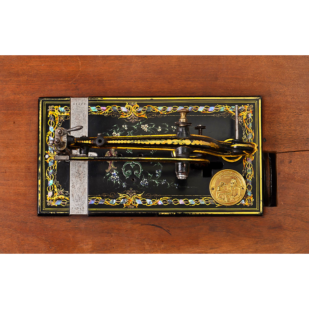 “Machine de grand Plaisir”. Black painted cast-iron. The machine is elaborately decorated with sparkling mother-of-pearl inlays. A brass plaque shows Thimonnier, the (French) inventor of the sewing machine, with one of his machines. Sliding plates engraved with the company name “J. Thabourin”. Low serial no. 22710. The machine has not been repainted or embellished. Complete with shuttle, needle and spooler (attached to the frame). In very good condition for its age. An extremely rare collector’s item!