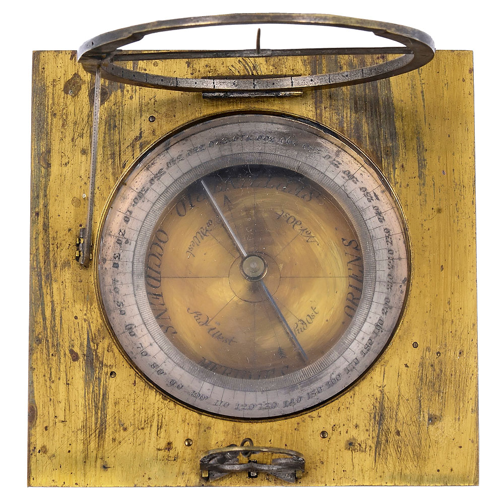 Presumably Augsburg, original lacquered brass, compass with brass rosette and silver-plated scale, Ø 3 1/6 in., external dimensions 4 ½ x 4 ½ in.; folding hour ring and latitude scale, folding plumb bob, original rod gnomon. – Johann Friedrich Brander (1713–1783) built very similar sundials; the condition of this sundial is good to very good (not patinated and not polished).