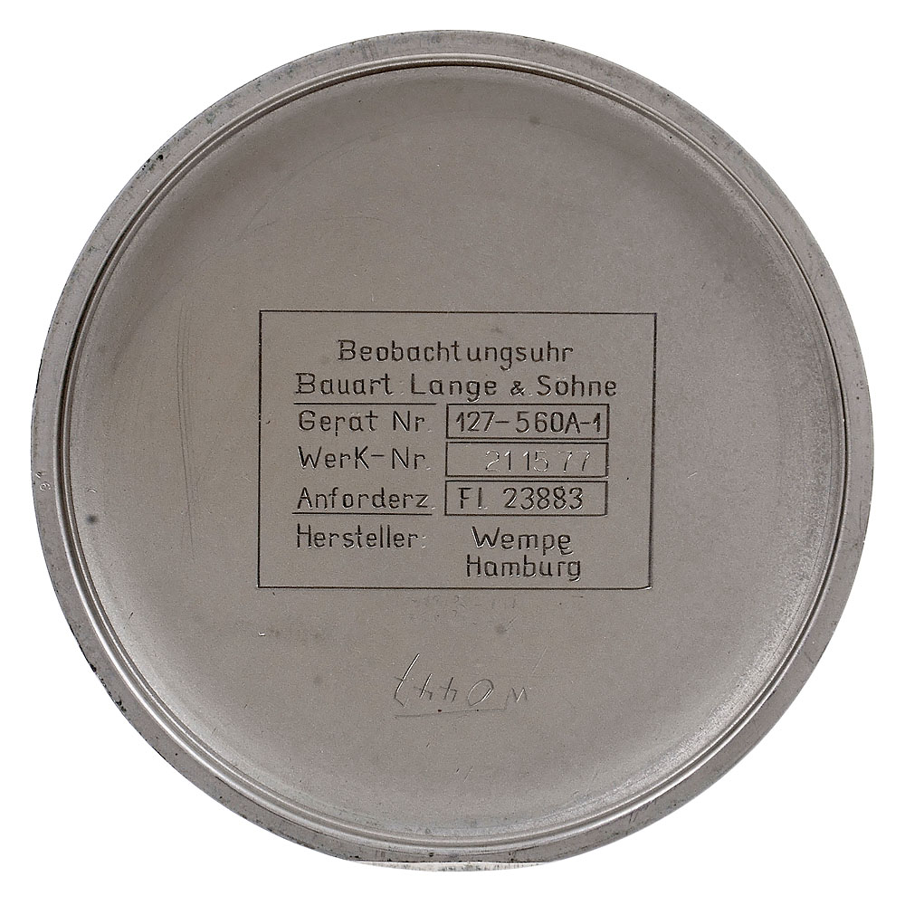 Lange & Söhne, Glashütte. Kaliber 48, Beobachtungsuhr, Aluminiumgehäuse, Ø 50 mm, schwarzes Lackzifferblatt, fluoreszierende Ziffern und Zeiger, zentrale Sekunde, signiert auf dem Werk “A. Lange & Söhne, Glashütte i. Sa., 211577”, graviert im Deckel “Beobachtungsuhr Bauart Lange & Söhne, Gerät Nr. 127-560A-1, Werk-Nr. 211577, Hersteller Wempe Hamburg”, mit Armband, funktioniert.