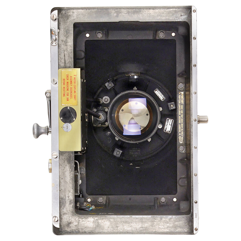 Fairchild Camera and Industry Corp., Syosset, N. Y. Aufklärungskamera K-38 Ser.-Nr. 54-492 für das Format 23 x 46 cm auf Luftbildfilm, bestehend aus Kamerakörper, Konus mit Optik und Filmmagazin, Mechanik und Optik einwandfrei und funktionstüchtig, Elektrik ungeprüft (28 V/6 Amp.), Maße mit Magazin 100 x 54 x 35 cm. Kamera: Verschlußaufzug mittels Kurbel und Auslösung sowie der Optik-Verschluß funktionieren (der laute Knall dabei ist original), Kamerazählwerk auf 09329. Optik-Konus: “Lens Cone 36 inch for K-38 Camera“, mit Bell & Howell, Chicago Typ I 8/36 inch (923 mm) Telephoto Ser.-No. 3207, gelber Punkt für Vergütung, Blende beweglich, Prüfung mit Punktlicht nicht möglich, doch Vorder- und Rücklinsen-Gruppe bei Punktlicht-Reflex sauber. Magazin: Ryan Industries Inc, Detroit. Magazin Film Aircraft Camera Type A-8B MIL-M-1421 B, Ser.-Nr. AF-53-4327, Filmansaugung mit Heiz-Element, beide Gummiwalzen sauberer, griffiger Zustand. – Kamera war in aktivem Einsatz, deutliche Benutzungsspuren, dieser Typus Kamera soll auch bei den U2-Flügen (U2 noch bis 2022 im Einsatz, etwa Ukraine) an Bord gewesen sein. Eindrucksvolles Ausstellungsstück für jedes Luftfahrt-und Militärmuseum. Denn zur Luftaufklärung wurden die Flugzeuge um die Kameras gebaut, nicht umgekehrt!