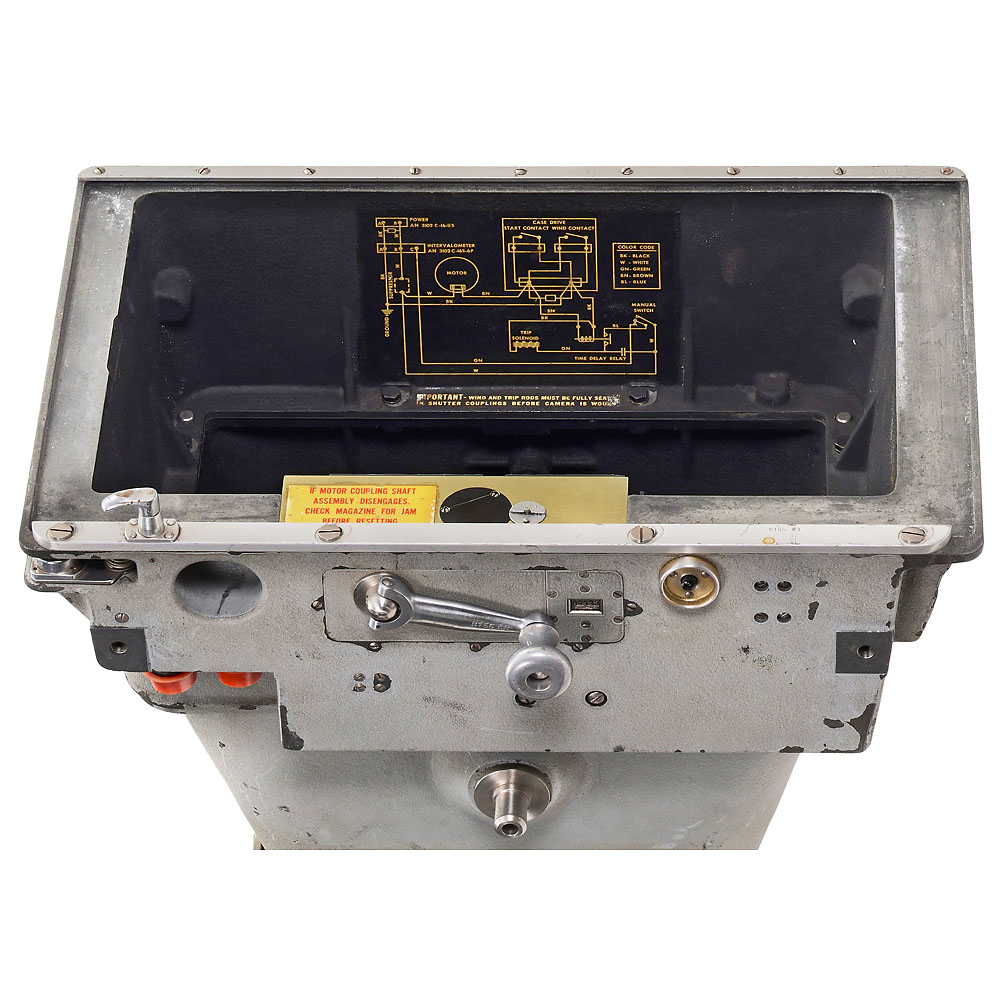 Fairchild Camera and Industry Corp., Syosset, N.Y. K-38 reconnaissance camera, serial no. 54-492, for 23 x 46 cm on aerial film, consisting of camera body, cone with lens, and film magazine. Mechanics and lens are in correct working order. Electrical components are untested (28 V/6 Amp). Dimensions with magazine: 100 x 54 x 35 cm. Camera: The shutter cocking mechanism (crank) and release, as well as the optical shutter, function (the loud bang is original). Camera counter reads 09329. Optical cone: “Lens Cone 36 inch for K-38 Camera”, with Bell & Howell, Chicago Type I 8/36 inch (923 mm) Telephoto lens, serial no. 3207, yellow dot for coating, movable aperture, testing with a point light not possible, but front and rear lens groups clean when illuminated with a point light. Magazine: Ryan Industries Inc., Detroit. Magazine Film Aircraft Camera Type A-8B MIL-M-1421 B, Serial No. AF-53-4327, film suction plate with heating element, both rubber rollers clean and grippy. – Camera was in active use, clear signs of wear; this type of camera is also said to have been on board U-2 flights (U-2 still in service until 2022, for example over Ukraine). An impressive exhibit for any aviation and military museum. Because for aerial reconnaissance, the aircraft were built around the cameras, not the other way around!