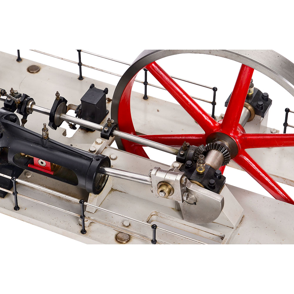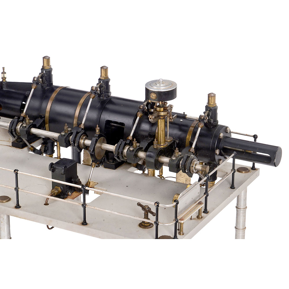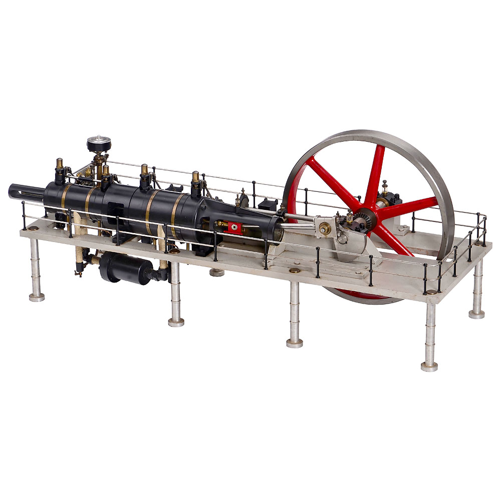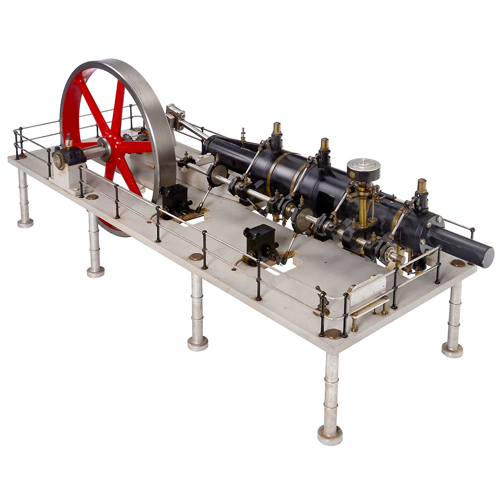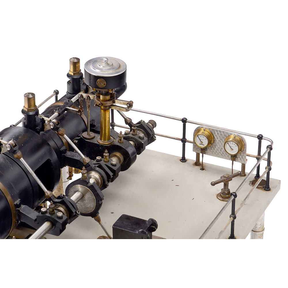 England, precision workmanship in stainless steel, only the flywheel (Ø 17 in.) is made of cast metal, two-cylinder compound steam engine with high- and low-pressure cylinders (Ø 3 and 4 ½ in.), valve control via eccentric rings, functioning speed regulator, steam cooler (condenser), 2 oil pumps, 12 glass oilers, 2 pressure gauges, overall dimensions 46 ½ x 19 1/3 x 19 in., tested with compressed air, in working order.