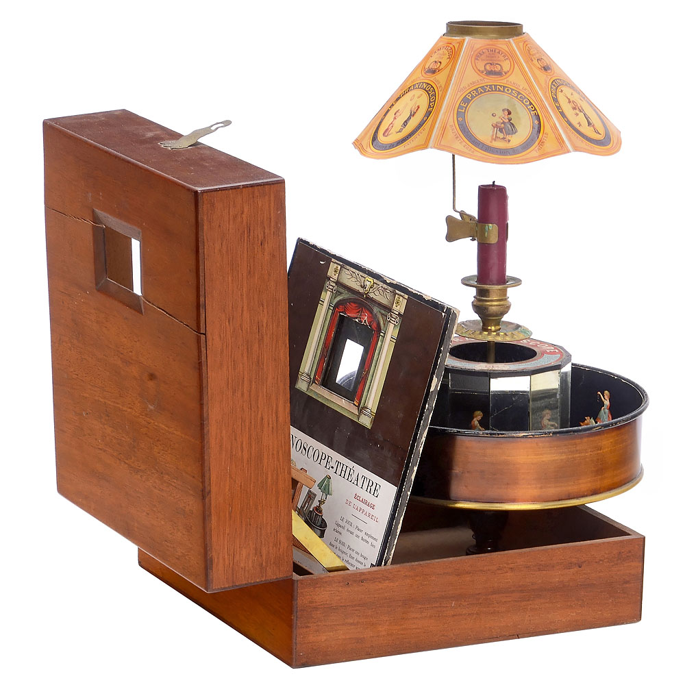 Reynaud, Paris. Lackierte Metalltrommel, Ø 22 cm, mit allen Spiegeln (einer beschlagen), Kerzenhalter, Schirm (ergänzt), in 25 cm breitem Mahagonigehäuse (Deckel mit Riß) mit Sichtfenster und Karten-Proszenium. Mit 10 kompletten Bildstreifen (mit Knicken) und Bühnenbildern, Nr. 1: Interieur und Nr. 1 Dekor original fest montiert, Nr. 2: Cirque, Nr. 3: Paysage und Nr. 3 Decor, Nr. 4: Neige und auf gebogenem Blech Nr. 4 Decor, sowie Nr. 5 der seltene Spiegel für Dekor Nr. 3 (mit Riß), ferner ist in der Öffnung des “Theatereinblicks” eine herausziehbare Glimmerscheibe. Guter Originalzustand. – Als Verbesserung des Zoetropes verwendete das Praxinoskop von Émile Reynaud eine Reihe von Spiegeln mit einem prismenähnlichen Effekt, um bewegte Bilder ohne das typische Flimmern zu erzeugen. – Literatur: Brian Coe, “The History of Movie Photography”, S. 35. – Ein gut erhaltenes Spielzeug aus der Frühzeit des bewegten Bildes.