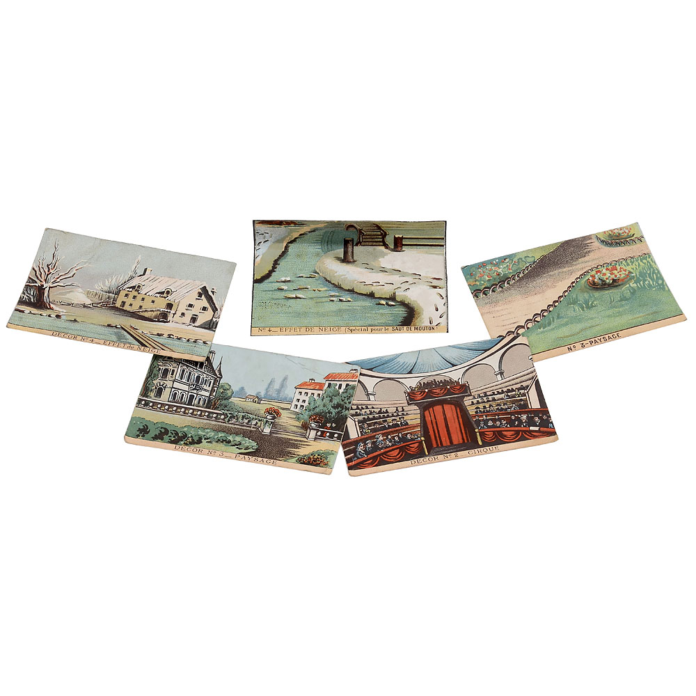 Reynaud, Paris. With 8 ½ in. (22 cm) diameter lacquered metal drum, with all mirrors (one fogged), candle holder, shade (replaced), in mahogany case with viewing window and card proscenium, wd. 9 ½ in. (25 cm). With all 10 strips (with cracks) and with stage sets, No. 1: Interieur and No. 1 Decor originally firmly mounted), No. 2: Cirque, No. 3: Paysage and No. 3 Decor, No. 4: Neige and on bent sheet metal No. 4 Decor, as well as No. 5 the rare mirror for Decor No. 3 (with crack). Furthermore there is a pull-out mica disc in the opening of the “theater view”. Good original condition. – An improvement of the zoetrope, Émile Reynaud’s praxinoscope used a series of mirrors with a prism-like effect to create moving images without the typical ‘flicker’ associated with ‘persistence of vision’ devices. – Literature: Brian Coe, “The History of Movie Photography”, p. 35. – A well-preserved example of an early pre-cinema toy.
