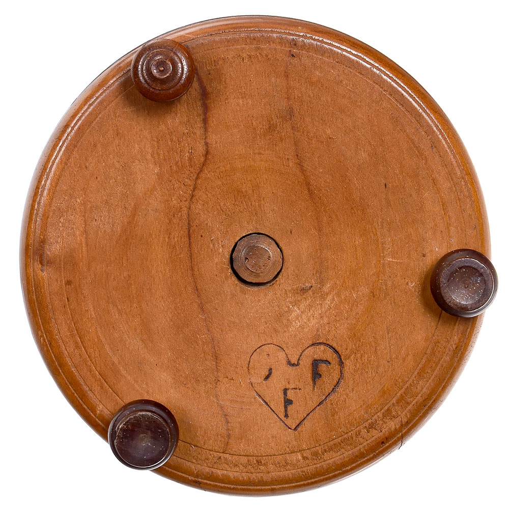 Culpeper-type, fruitwood, 4 ½ in. circular base on three rounded wood feet, 2 in. stage plate supported by three turned legs, outer tube covered with fishskin-patterned paper, draw tubes covered with paper, base branded “JFF” in a heart, threaded dust cap on eyepiece, 1 lens, single mirror on wood hinge, height 12 ½ in., one fruitwood specimen slider.