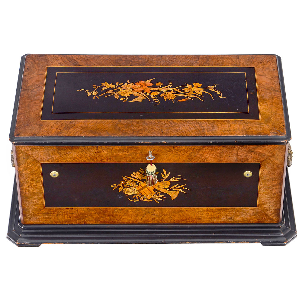 Hersteller: “B.A. Brémond”, Genf. Schweizer Walzenspieldose, Serien-Nr. 5686 (auf Melodienblatt), mit 18 Zungenstimmen, 7 Glocken, Trommel und Kastagnette, Messingwalze mit 10 Titeln, Breite 41 cm, 54 Töne plus 20 Zungen für die Begleitinstrumente in 4 Stahlkämmen (komplett), furniertes Holzgehäuse mit Intarsien auf dem Deckel und der Front, 2 schwere Messinggriffe, Maße 79 x 47 x 35 cm. Sehr gut spielender Zustand.