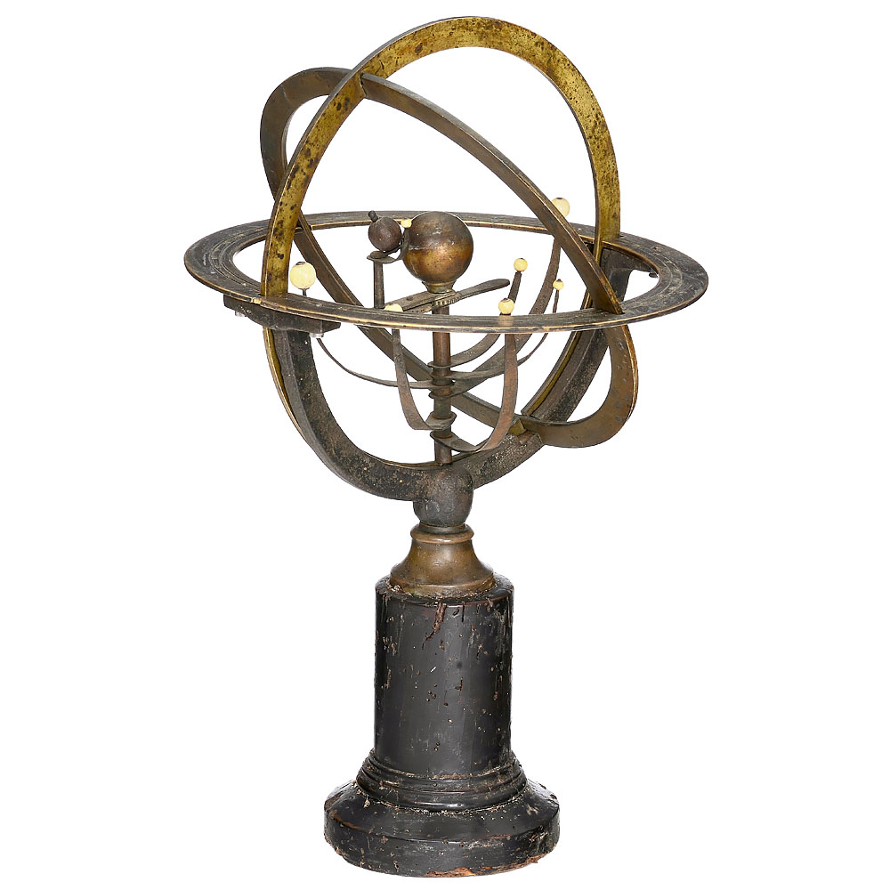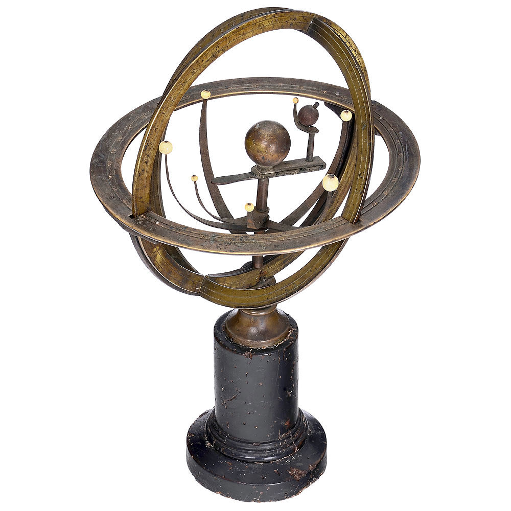 Italienisches Planetenmodell, im Zentrum die Sonne, symbolisiert durch eine Messingkugel, umgeben von der Erde mit ihrem Mond, der durch Messingzahnräder angetrieben wird, 7 weitere Planeten, gravierter Äquatorring und 2 mit Equinozio und Solstizio (Äquinoktium und Sonnenwende) gravierte Meridianringe aus Messing, auf gedrechseltem und ebonisiertem Holzständer, Sockel mit Wurmlöchern. – Höhe 39 cm.