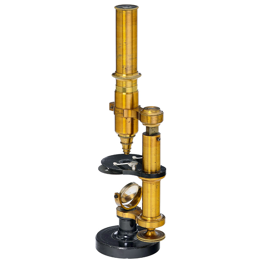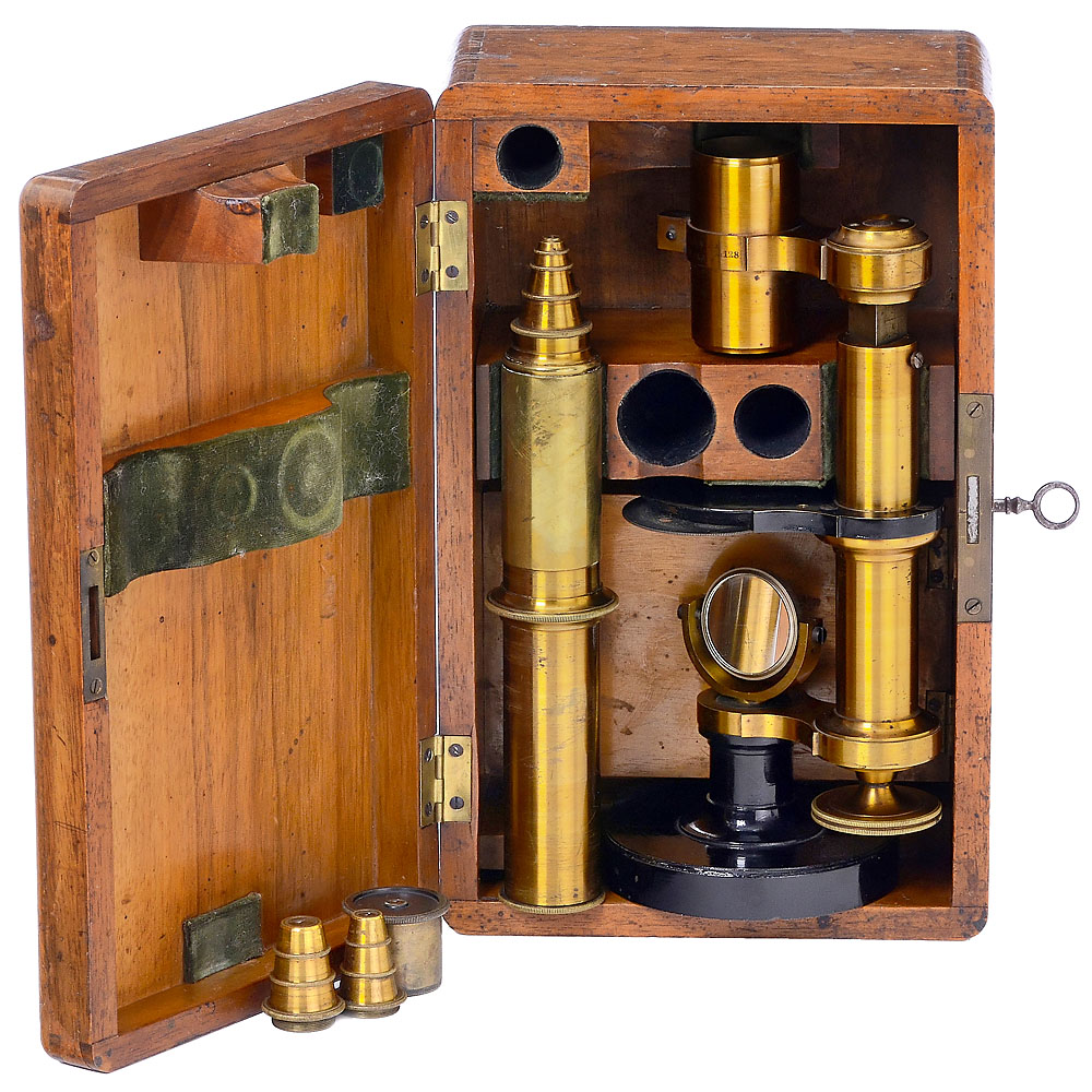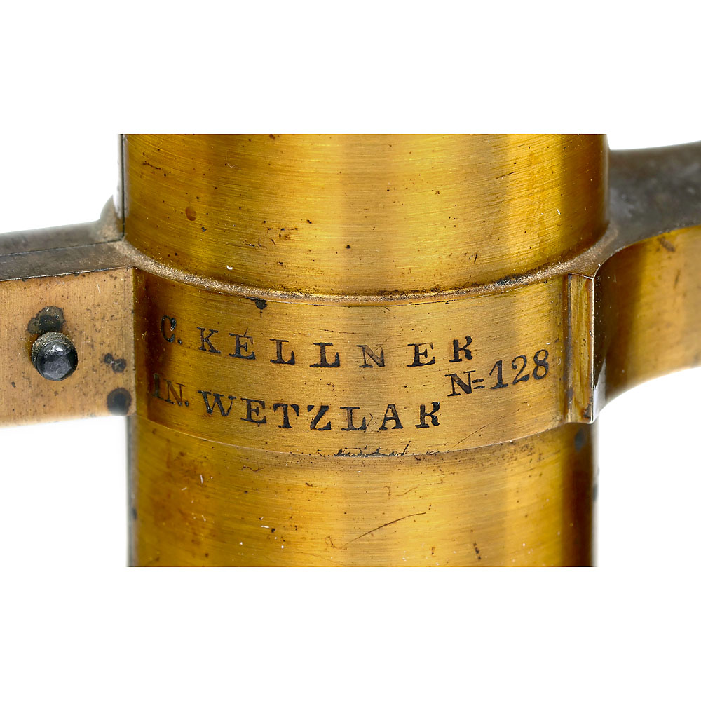Signatur “C. Kellner in Wetzlar N. 128”, original zaponiertes Messing mit schwarzem Eisenfuß, Höhe 33 cm, 2 Okulare, 3 Objektive, Grobeinstellung per Tubus, Feineinstellung hinten unter der Säule, Lochblendenscheibe unter dem Tisch, Mikroskop und alle Teile sind vollkommen original und bestens erhalten! Mechanisch und optisch sehr gut, Nussbaum Kasten. – Carl Kellner hat zwischen 1851 und seinem frühen Tod im Jahr 1855 nur circa 165 Mikroskope mit seiner Signatur gefertigt. Das Unternehmen wurde zunächst von seinem Mitarbeiter Friedrich Belthle fortgeführt. 1865 wurde Ernst Leitz Teilhaber und übernahm den Betrieb 1869 komplett. – Kellners Optisches Institut und Werkstatt gilt als Keimzelle des Hauses Leitz.