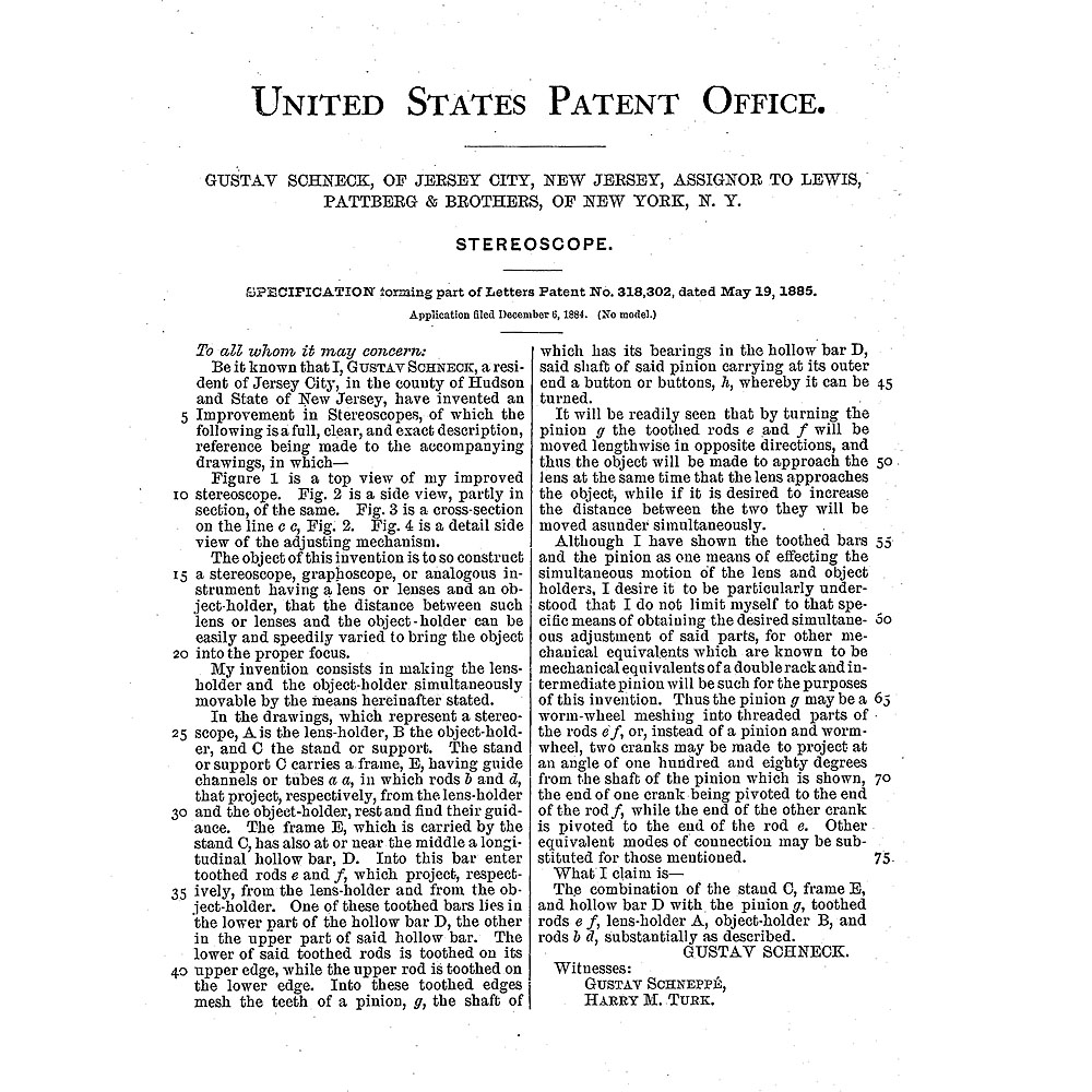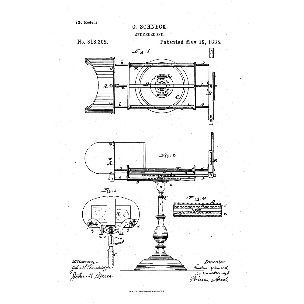 Gustav Schneck, USA. Patent-Nr. 318302, eingestanztes Patentdatum 19. Mai 1885, das Patent bezieht sich auf die Fokussierung mit Zahnstangentrieb auf den Linsenhalter und den Bildhalter, ein für Holmes-Typ-Stereobetrachter einmaliges Verfahren, für Stereo-Karten 9 x 18 cm, vernickeltes Metall, Sockel und Augenmuscheln mit Samt bezogen, Gesamthöhe 34 cm, mit einer Stereo-Karte “Die Statuen von Theben”, sehr gut funktionierender Originalzustand, sehr selten, uns ist nur ein weiteres Exemplar bekannt.