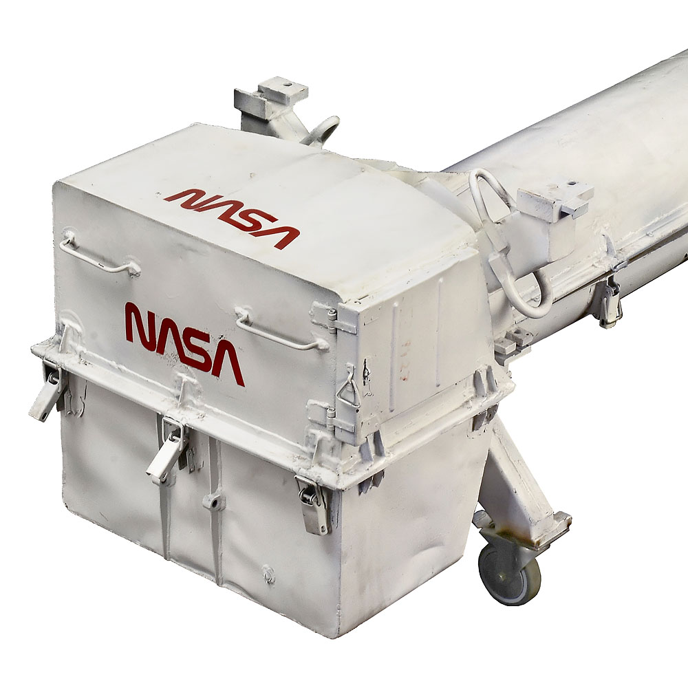 Fiberglass and steel, high-gloss silver metallic paint, length 125 in (316 cm), Ø 26 in., 4 rotating tailfins and 4 fixed nosefins. In heavy-duty NASA steel transport case, length 129 in. (325 cm). – An aero-dynamic wind tunnel test model, used in the Central Institute of Aviation Motors (CIAM)in Moscow. Constructed in a joint effort between the American National Aeronautic and Space Administration (NASA) and the Russian Central Institute of Aviation Motors (CIAM) in Moscow. – An amazing and rare artefact for space flight history collections!