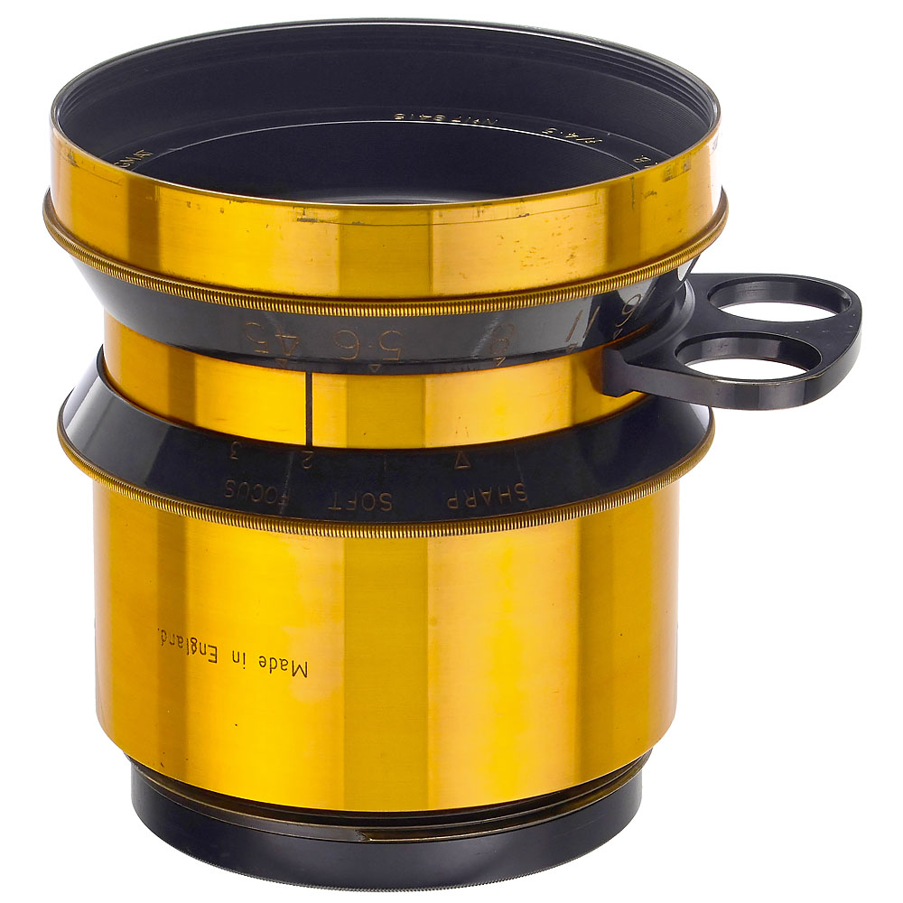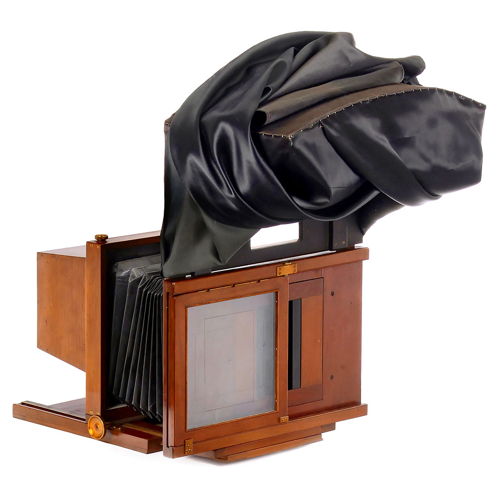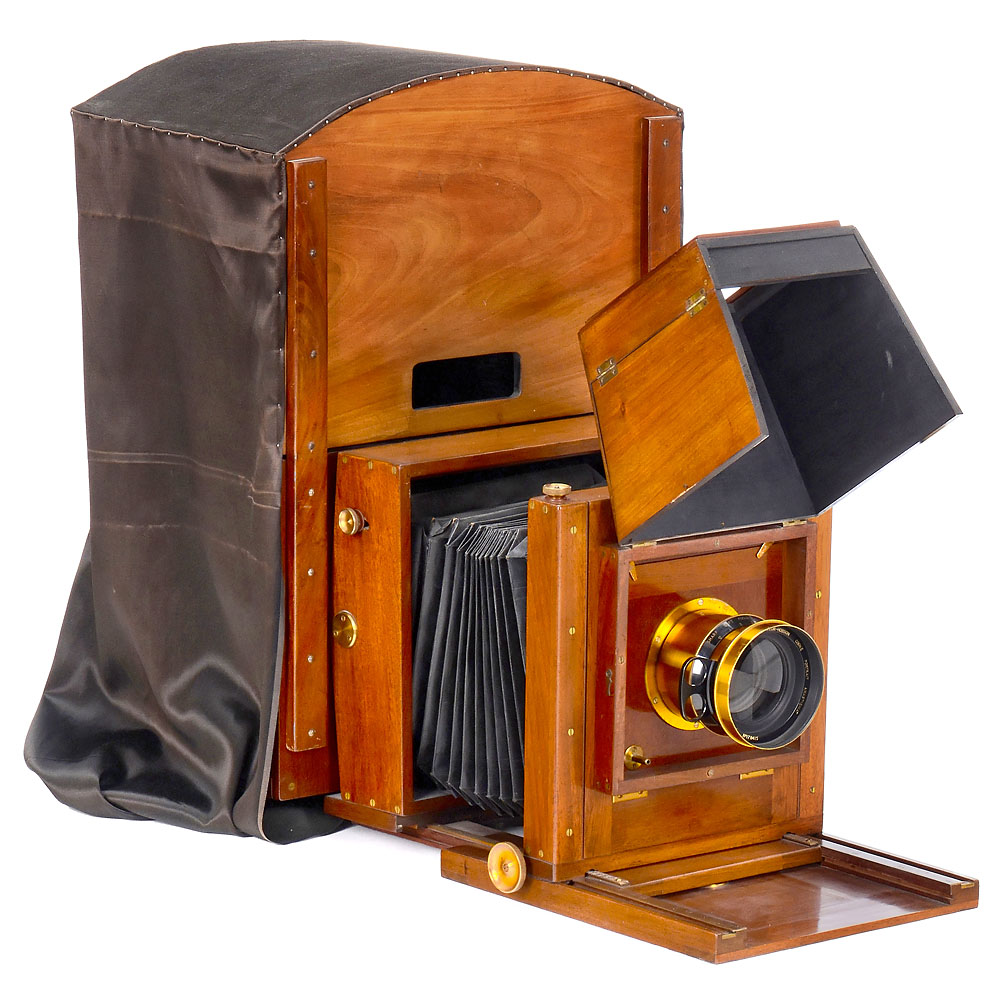 Fallowfield, England. Mahagoni mit Messingbeschlägen, Sondermodell mit Tuchhalter, in der ein Sehschlitz zur Kontrolle der Aufnahme im Moment der Belichtung eingearbeitet ist. Frontstandarte schräg verschiebbar, mit aufklappbarer Lichtschutzhaube aus gleichem Mahagoni, ganz vorn ist eine Halterung für Effektvorsätze eingearbeitet. Mit Taylor-Hobson Cooke Portrait Anastigmat Series IIB 4,5/12 ¾ inch No. 178415, leichtgängige Weichzeichner- und Blendenverstellung, Glas unter Punktlicht: zwischen Frontglied minimaler Altersbelag, sonst sauber. Maße: 36 x 30 x 37 cm (mit Haube 68 cm), schwarzer Lederbalgen an Kanten einige Risse. Rückteil um zwei Achsen schwenkbar, mit Wechselschlitten, herausnehmbaren Reduzier-Einsätzen im Rückteil von maximal 22 x 22 cm bis 7 x 16 cm, dazu 2 passende Atelierkassetten für 19,3 x 24,4 cm bzw. 21,8 x 16,7 cm, in beiden Reduzierer für 21,7 x 16,7 cm und 16,6 x 12,2 cm. Gut erhaltene und auffallende Studiokamera, die zum Arbeiten damit anregt.