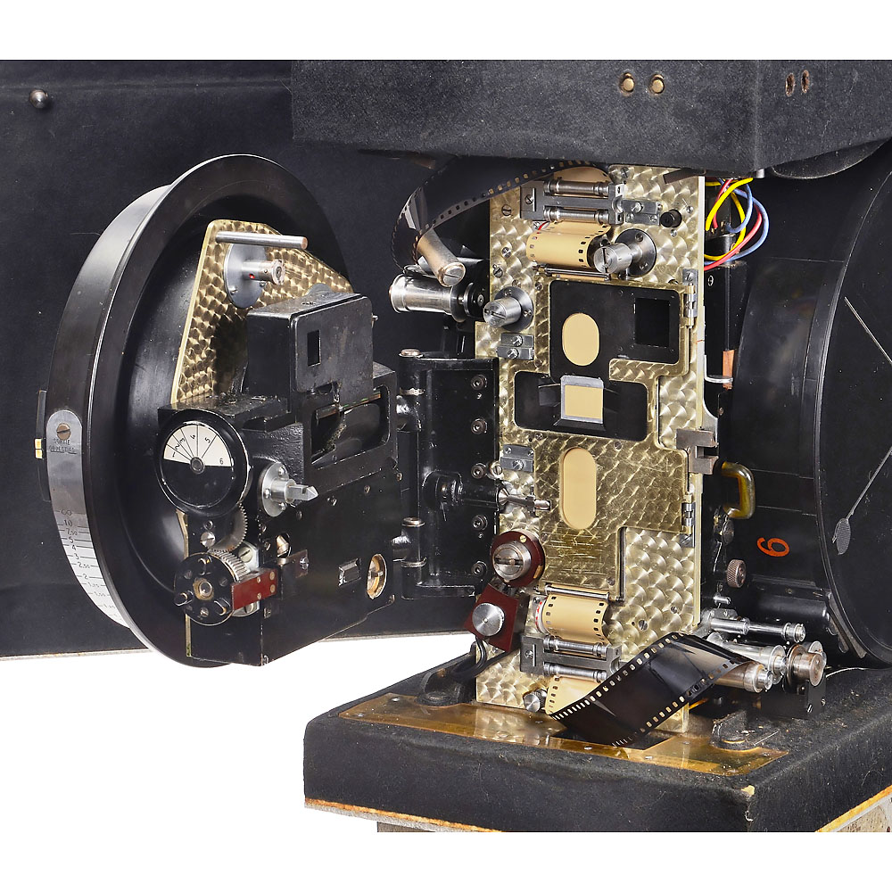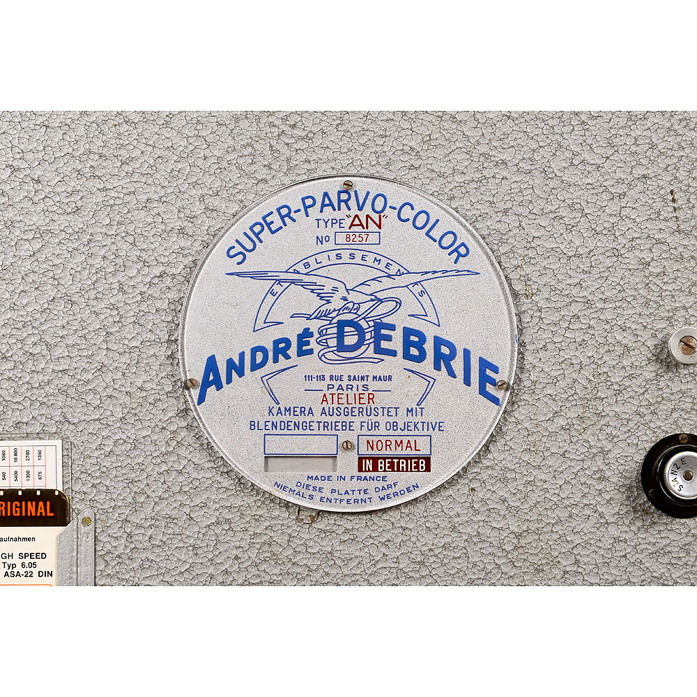 André Debrie, Paris. Geräuschgedämmte Atelier-Kamera für 35mm-Film in zwei Kassetten à 300 m Filmlänge (vorhanden). Antrieb durch eingebauten Debrie-Synchronmotor für 24 B/s, 380 Volt. Starkstromschalter und Stecker an der Kamera. Objektiv: Cooke 1:2/50 mm. Suchersystem: rotierender Reflexspiegel auf dem Umlaufsektor. Das Mattscheibenbild kann über die Fernrohrlupe an der Kamerarückseite betrachtet werden. In der Kamera Schrittschaltwerk mit zwei Zug- und Sperrgreifern. Sektorenblende auch im Lauf verstellbar. Die Kamera steht auf dem hydraulischen Ölpumpstativ von Debrie (Hydraulik intakt). Der Schwenk- und Neigekopf ist mit der Studiokamera über eine Schnappkeilplatte verbunden. Kamera und Stativ zeigen das unversehrte “Adler-Logo” von Debrie Paris. – Elektrische Funktionen ungeprüft. – Dabei: Ein großes ledernes Balgenkompendium, Aluminium-Koffer mit 3 Original-Kassetten. Setphoto: Filmstar Brigitte Bardot und ihr Partner 1957 in ihrem Film “Die Pariserin” in den Pathé-Studios Paris an einer der Debrie-Super-Parvo-Color-Kameras. – Neunzig Prozent der europäischen Tonfilme wurden seit 1932 mit Super-Parvo-Kameras von Debrie aufgenommen. Der ab 1950 verstärkte Einsatz von Farbfilmen nötigte die Firma André Debrie zum Bau einer Spiegelreflexkamera, die unter dem Namen “Super Parvo Color” angeboten wurde. Ein neues größeres Gehäuse mit besserer Schalldämpfung berücksichtigte auch die inzwischen höheren Empfindlichkeiten der Studiomikrophone. Alle großen Filmgesellschaften Europas arbeiteten bis ca. 1970 mit Super-Parvo-Color-Kameras, unter anderem die CCC Film Berlin, Bavaria München, Studio Hamburg, Wien-Film, DEFA-Spielfilmstudio Babelsberg. Viele erfolgreiche Produktionen wie die “Sissi”-Trilogie mit Romy Schneider oder “Der Hauptmann von Köpenick” mit Heinz Rühmann wurden mit Super-Parvo-Color-Kameras gefilmt. Ein Kameratyp mit filmgeschichtlichem Hintergrund.