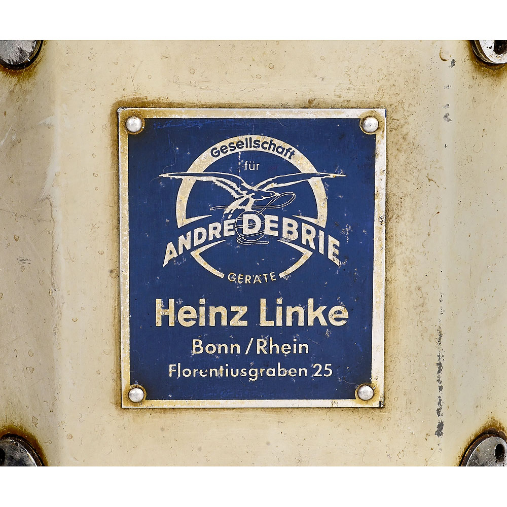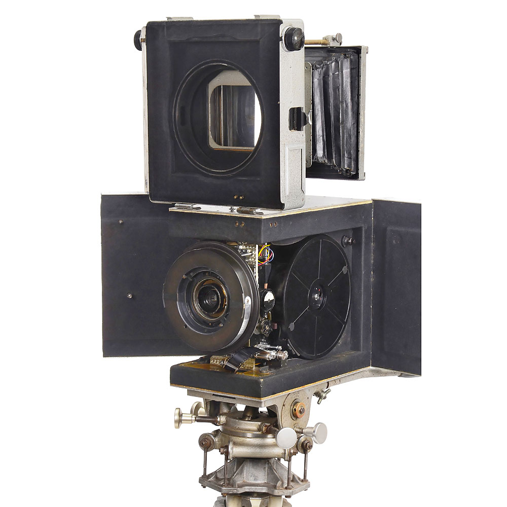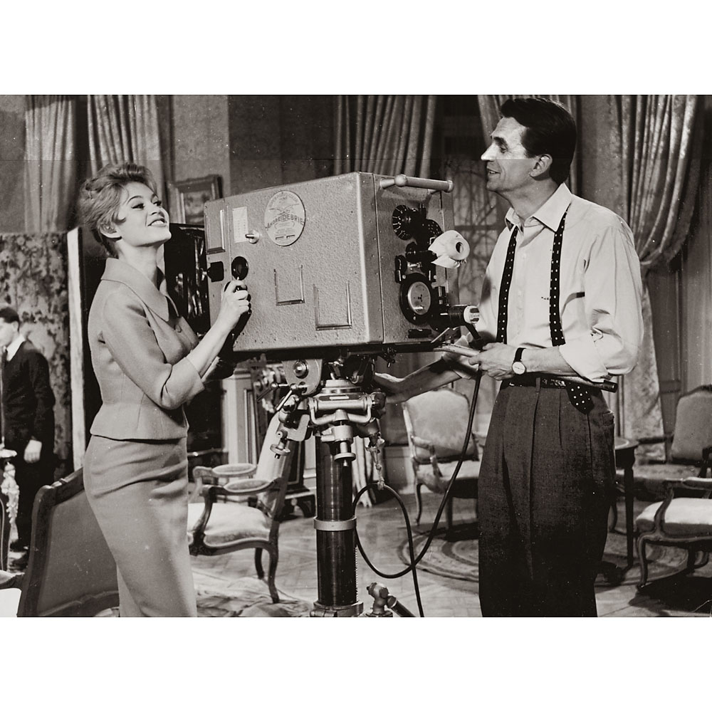 André Debrie, Paris. Soundproofed studio camera for 35mm film in two 300m cassettes (included). Driven by a built-in Debrie synchronous motor for 24 fps, 380 volts. High-voltage switch and plug on the camera. Lens: Cooke 1:2/50 mm. Viewfinder system: Rotating reflex mirror on the rotating sector. The focusing screen image can be viewed via the telescope magnifier on the back of the camera. Inside the camera is a stepping mechanism with two pull-and-lock claws. Sector shutter adjustable even while running. The camera sits on a hydraulic oil pump tripod by Debrie (hydraulics intact). The pan-tilt head is connected to the studio camera via a snap-on wedge. Camera and tripod bear the intact Debrie Paris “eagle” logo. – Electrical functioins untested. – In addition: A large leather bellows compendium, aluminum case with 3 original cassettes. Set photo: Film star Brigitte Bardot and her partner in 1957 during the filming of “La Parisienne” at the Pathé Studios in Paris, using one of the Debrie Super Parvo Color cameras. – Note: Ninety percent of European sound films since 1932 have been shot with Debrie Super Parvo cameras. The increased use of color film from 1950 onwards necessitated the André Debrie company to develop a single-lens reflex camera, which was marketed under the name “Super Parvo Color.” A new, larger body with improved sound insulation also took into account the now higher sensitivities of studio microphones. All major European film companies worked with Super Parvo Color cameras until around 1970, including CCC Film Berlin, Bavaria Film Munich, Studio Hamburg, Wien Film, and the DEFA Feature Film Studio Babelsberg. Many successful productions, such as the “Sissi” trilogy with Romy Schneider or “The Captain from Köpenick” with Heinz Rühmann, were filmed with Super Parvo Color cameras. This camera type has a significant history in film.