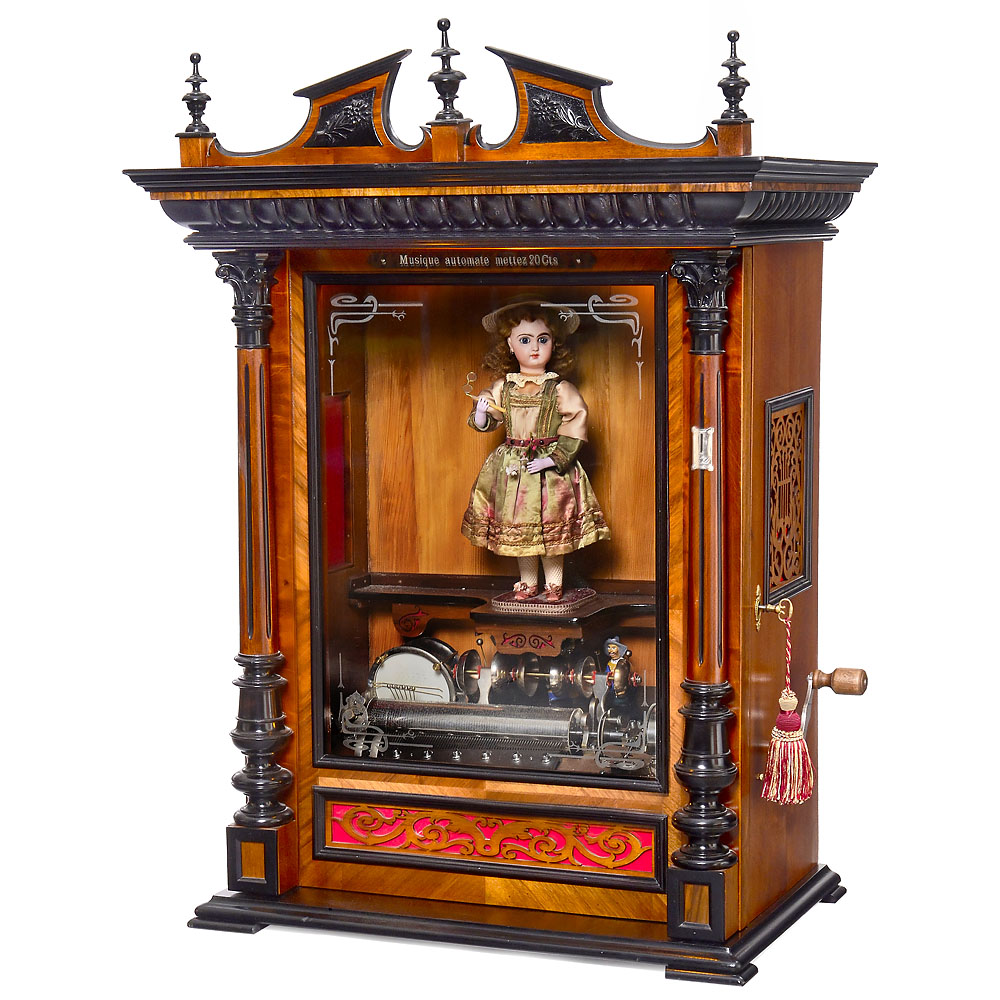 Cylinder musical movement by Mermod Frères, no. 107659, playing 6 airs accompanied by drum and 3 polychrome Mandarin automata striking 6 optional bells, 76 teeth in two combs (complete), coin-activated crank-wound nickel-plated movement, parachute safety check, automatic melody change, coin mechanism, with “Bébé Eventail” doll automaton by Leopold Lambert, bisque porcelain doll’s head by Jumeau, with fixed blue paperweight eyes, pierced earlobes with earrings, curly blonde mohair wig, hands made of molded material, holding a bouquet of flowers and a lorgnette, in a silk costume with lace trim, matching hat. The doll turns her head and nods, lifts the flowers with her left hand while the other hand lifts the lorgnette. In walnut case with coin compartment, sound frets, electric illumination, pediment with turned finials and embossed plaque of “Musique automate mettez 20 Cts”, wd. 32 x dp. 19 1/3 x ht. 43 1/3 in. (81 x 49 x 110 cm), with crank and cabinet key. – Excellent restored playing condition.