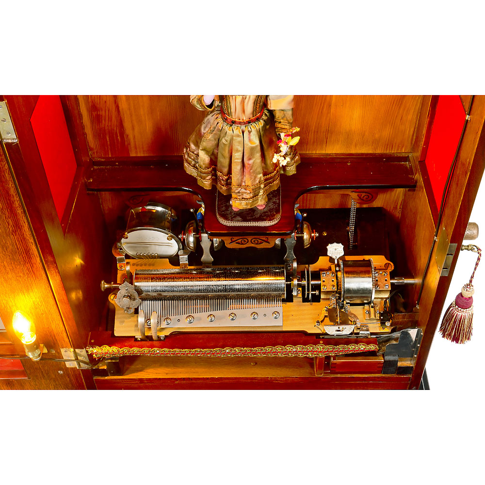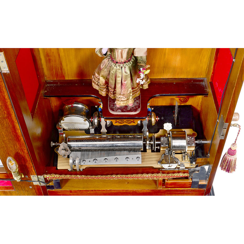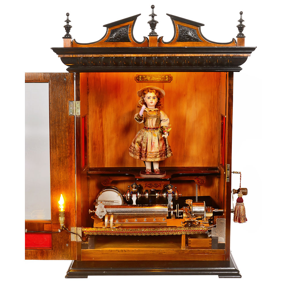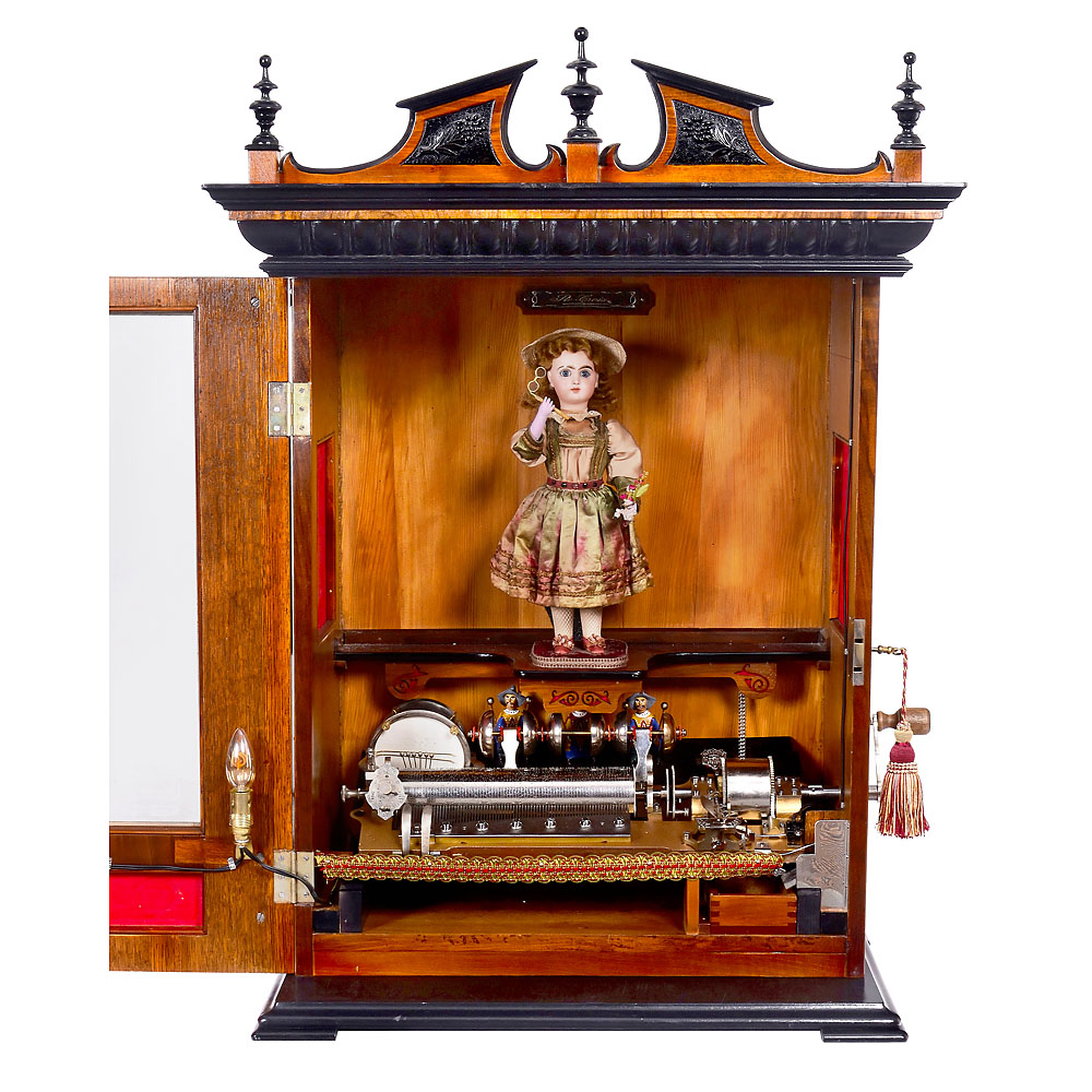 Walzenspielwerk von Mermod Frères, Nr. 107659, 6 Melodien begleitet von 6 abschaltbaren Glocken, gespielt von 3 farbig bemalten Mandarin-Figuren und Trommel, 66 Töne plus 10 Zähne für die Begleitinstrumente im Stahlkamm (komplett), Kurbelaufzug, vernickelte Mechanik, Parachute-Sicherheitseinrichtung, automatischer Melodienwechsel, Münzmechanik, mit Puppenautomat “Bébé Eventail” von Leopold Lambert, Biskuitporzellan-Puppenkopf von Jumeau, mit feststehenden blauen Paperweight-Augen, durchstochenen Ohrläppchen mit Ohrringen, gelockter blonder Mohairperücke, Händen aus Masse, einen Blumenstrauß und eine Lorgnette haltend, in Seidenkostüm mit Spitzenbesatz, passender Hut. Die Puppe dreht ihren Kopf und nickt, hebt mit der linken Hand die Blumen hoch, während die andere Hand die Lorgnette anhebt. Nußbaumgehäuse, Klangöffnungen, elektrische Beleuchtung, Oberteil mit gedrechselten Zierspitzen und geprägter Plakette “Musique automate mettez 20 Cts”, Maße 81 x 49 x 110 cm, mit Kurbel und Gehäuseschlüssel. – Exzellent restaurierter und spielender Zustand.