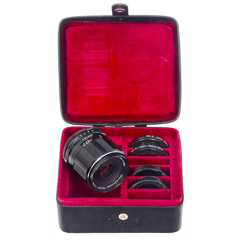 Asahi Opt., Japan. No. 3605072, for M42, it consists of both Quarz and Fluoride lenses and was designed for use with ultraviolet, visible and infrared light. The fully achromatic correction results in no focus shift between UV, VIS and IR, thus allowing visual focus without correction. Achromatic correction range 220 … 1000 nm. Filter mount M49. Product no. 43851 on underside of auto/man lever. With instructions, following narrowband interference filters for infrared photography R62B, R68B and 862 nm, and for ultraviolet photography 365 nm. Glass clean under point light, with leather case for the outfit and original box. One of the great Pentax rarities. Mint condition.