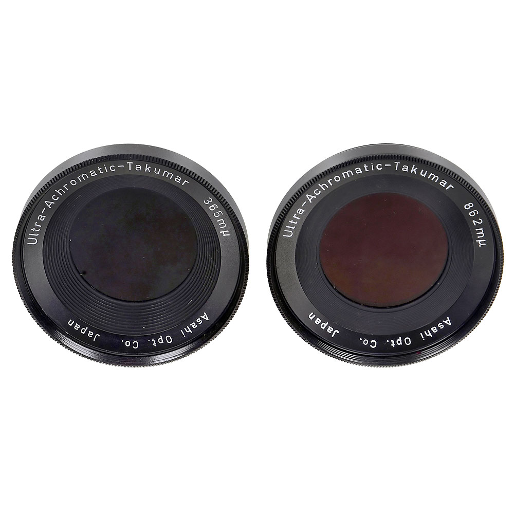 Asahi Opt., Japan. Nr. 3605072, für M42, bestehend aus Quarz- und Fluorit-Gläsern, berechnet zur Anwendung im UV, sichtbaren Licht und Infrarot. Die volle achromatische Korrektur erzeugt keine Brennweitenabweichung zwischen UV, VIS und IR, was Fokussieren ohne Korrektion erlaubt. Achromatische Korrektur für 220 … 1000 nm. Filtergröße M49. Produkt-Nr. 43851 auf der Unterseite der Blendenhebels. Mit Anleitung, folgende engbandige Interferenzfilter für Infrarot R62B, R68B und 862 nm, und für UV 365 nm. Glas unter Punktlicht sauber, mit Lederköfferchen für alles und Original-Schachtel. Eine der großen Pentax-Raritäten. Neuwertig erhalten.