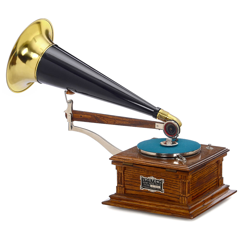 Hersteller: “Victor Talking Machine Co.”. Serien-Nr. 20894. Eichengehäuse mit Ecksäulen, frühes Victor-Schild noch ohne Hund. Doppelfederwerkmotor, Plattenteller Ø 18 cm, “Exhibition”-Schalldose, Messingtrichter auf Schwenkstab, Ø 24,5 cm, restauriert, gut funktionierender Zustand, Motor etwas zu laut.