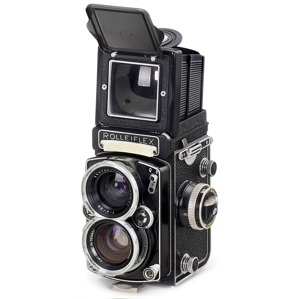 Franke & Heidecke, Braunschweig. Nr. W 2492801, mit Planglas, Zeiss Distagon 4/55 mm, Nr. 3506831, Objektiv unter Punktlicht sauber, Synchro-Compur 1–1/500 Sek. und Blenden-/Zeit-Einstellräder laufen gut, Belichtungsmesser funktioniert, Benutzungsspuren am Filmtransportrad, sonst gut erhalten. Gesuchte Anwenderkamera mit früher Produktions-Nummer. Mit Diffusor, Deckel und Tasche. Eine der gefragtesten TLR-Kameras!