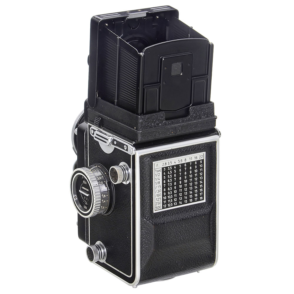 Franke & Heidecke, Braunschweig. Nr. W 2493101, mit Planglas, Zeiss Distagon 4/55 mm, Nr. 3461197. Glas unter Punktlicht sauber, Synchro-Compur 1–1/500 Sek. und Blenden-/Zeit-Einstellräder laufen gut, Benutzungsspuren am Filmtransportrad und den Filterfassungen, sonst neuwertig. Gesuchte Anwenderkamera mit früher Produktions-Nummer. Wohl eine der gesuchtesten TLR-Kameras! Mit Deckel, Tasche und Trageriemen.